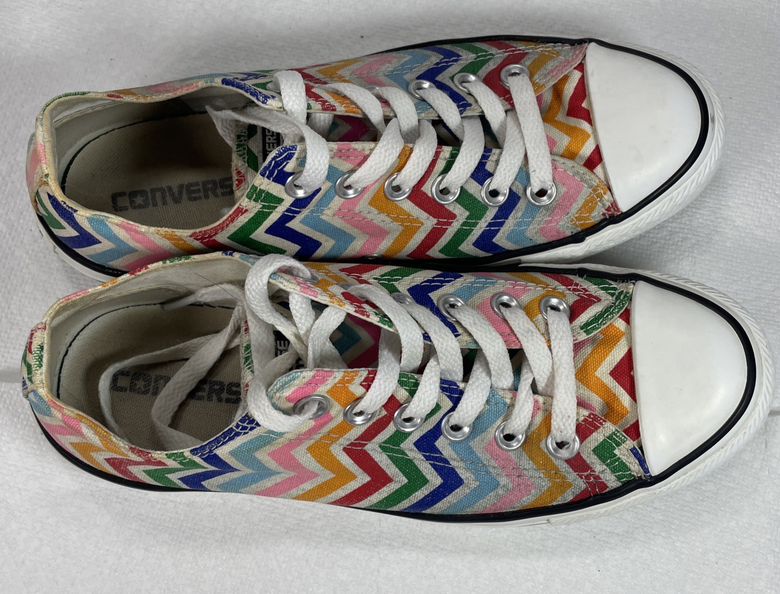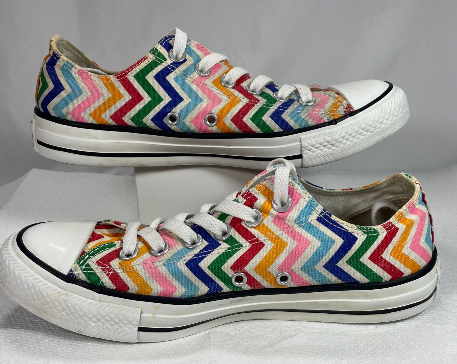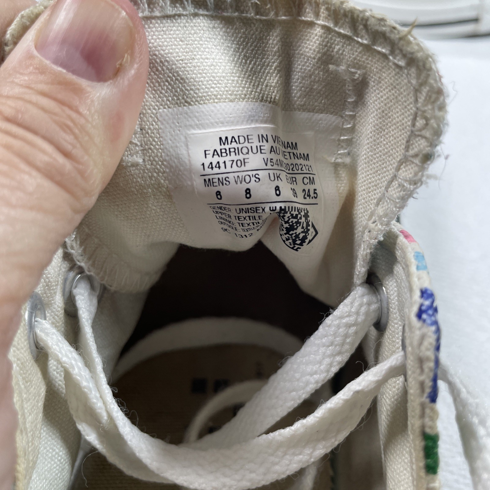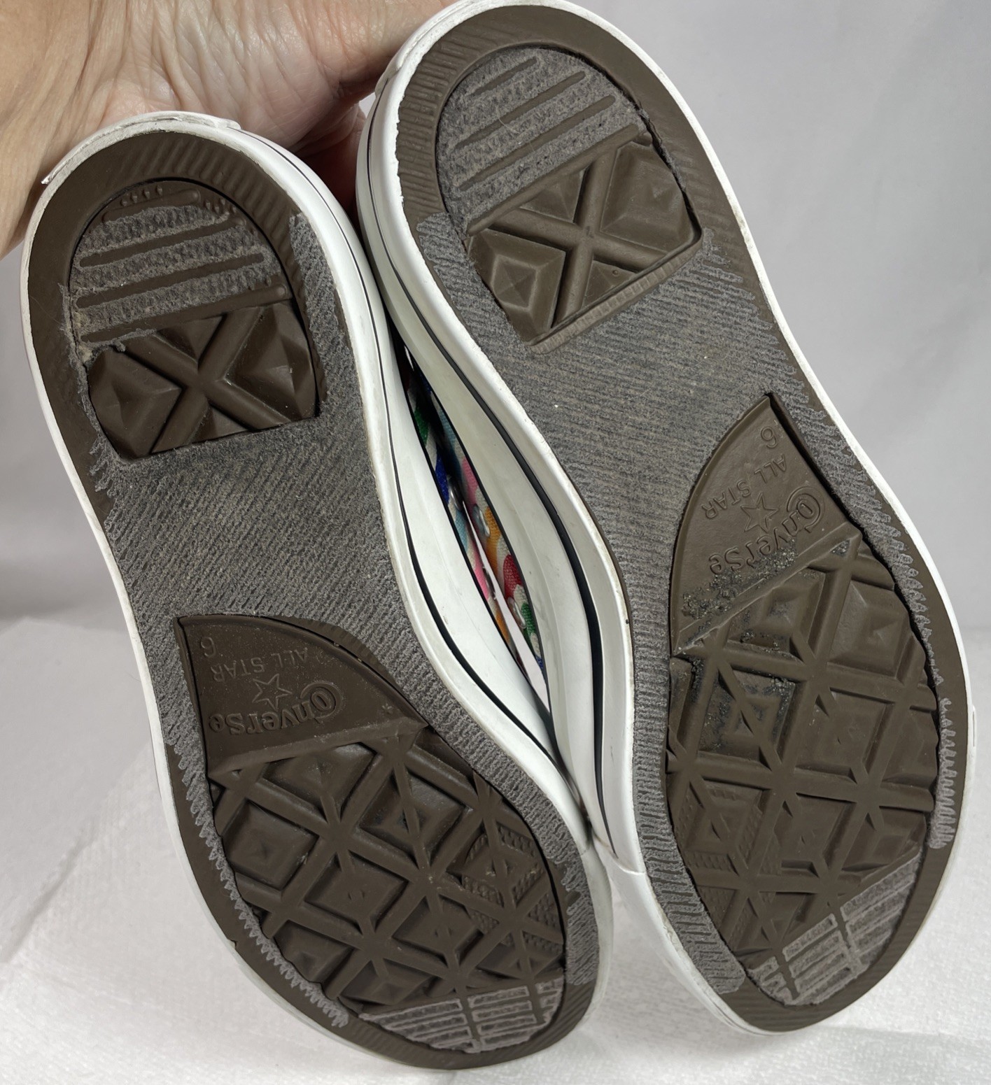 The product is a pair of Converse Chuck Taylor All Star sneakers in size men's 6, women's 8. These lace-up shoes are made of canvas with a rubber outsole, suitable for travel and casual occasions. They feature a multicolor design and come in standard width. The unisex sneakers have a textile lining and foam insole for comfort. With the iconic Chuck Taylor character and multicolor theme, these shoes are a stylish and versatile option for everyday wear. Made in Brazil, they are part of the Converse Chuck Taylor All Star product line.