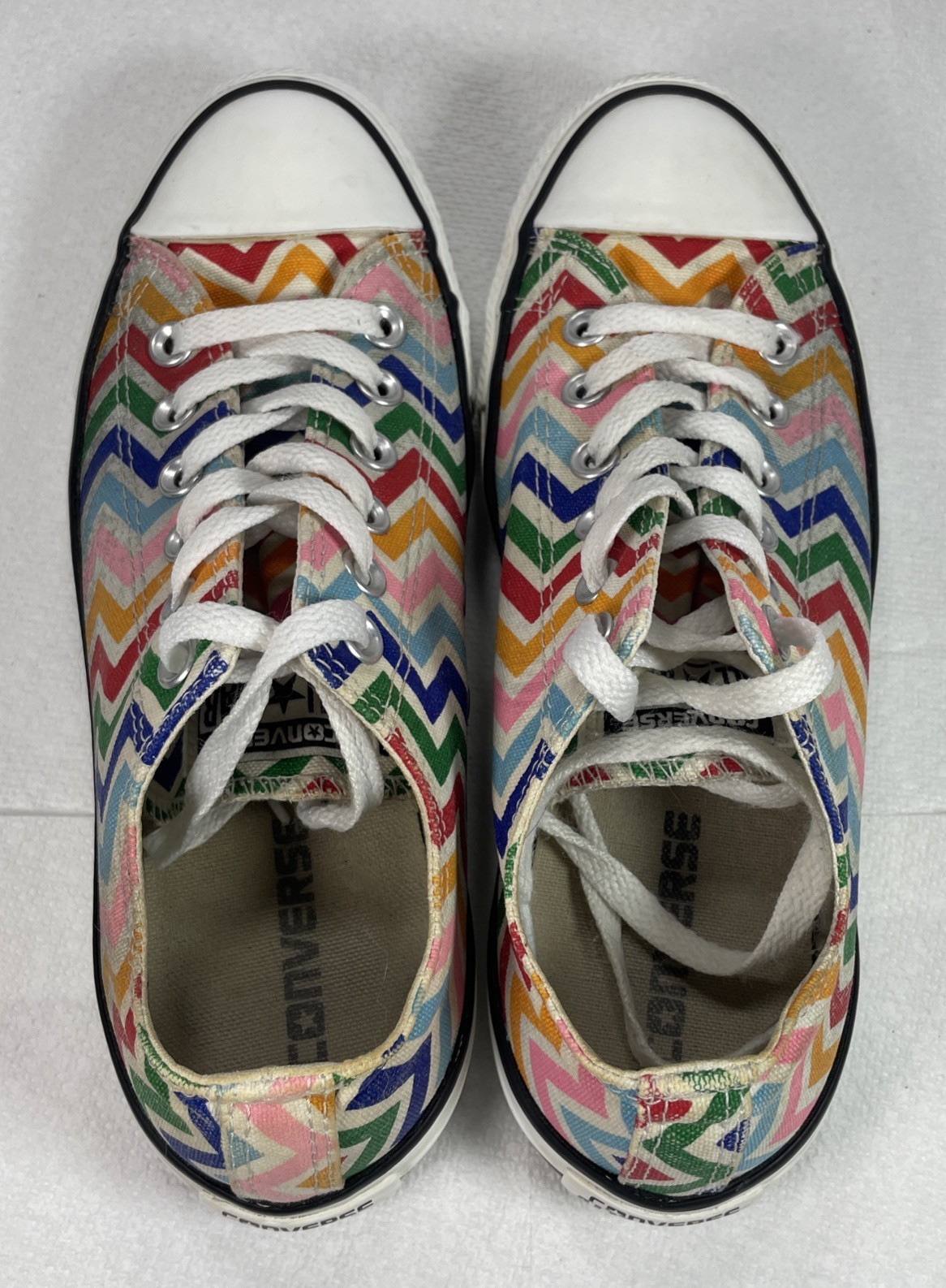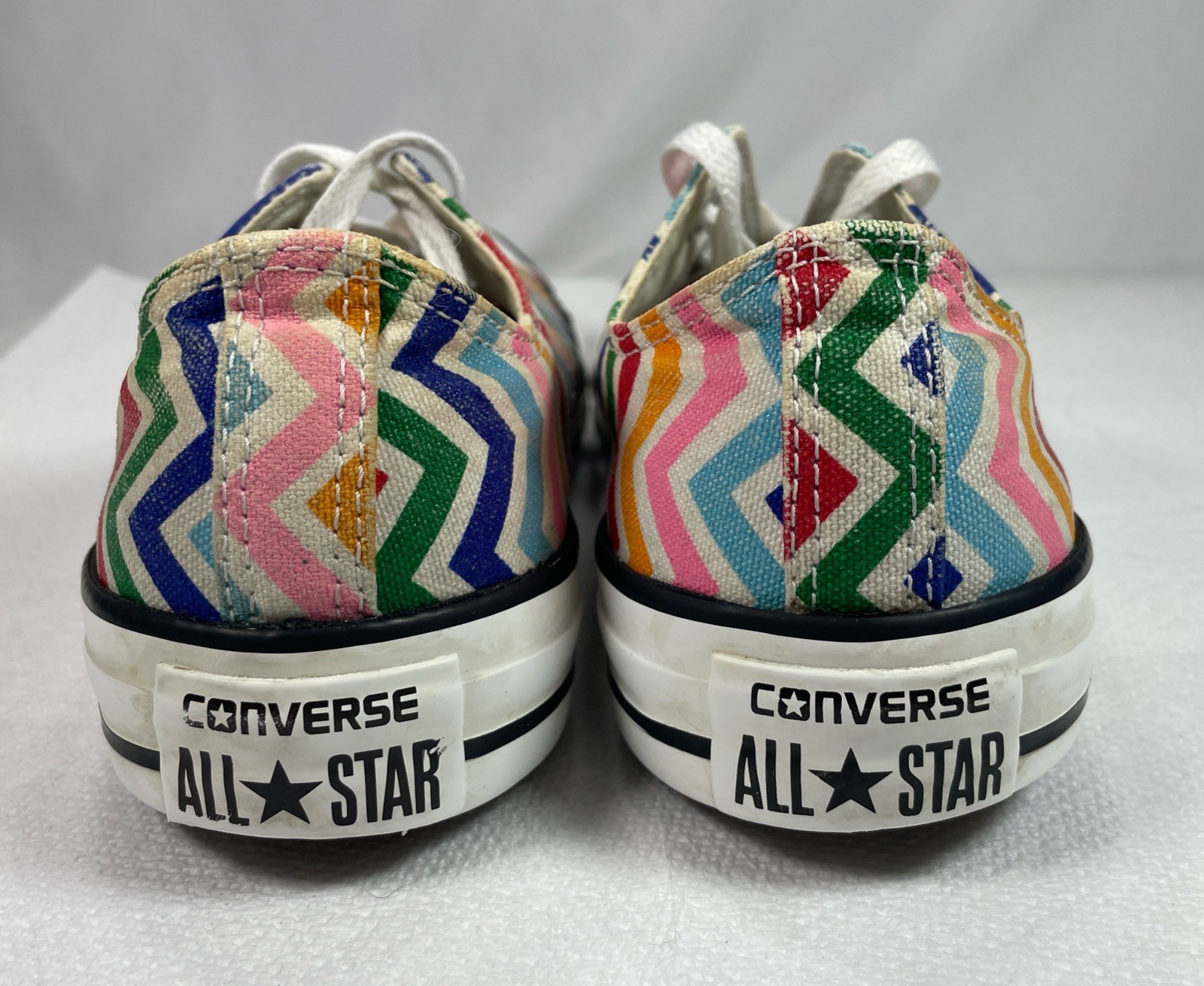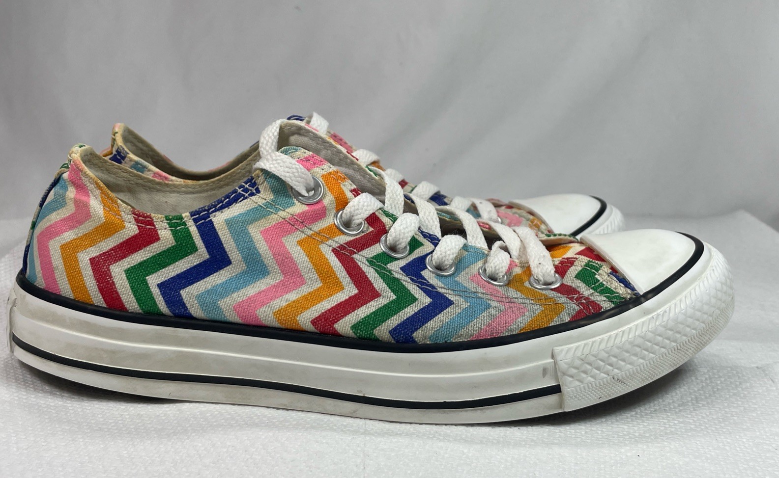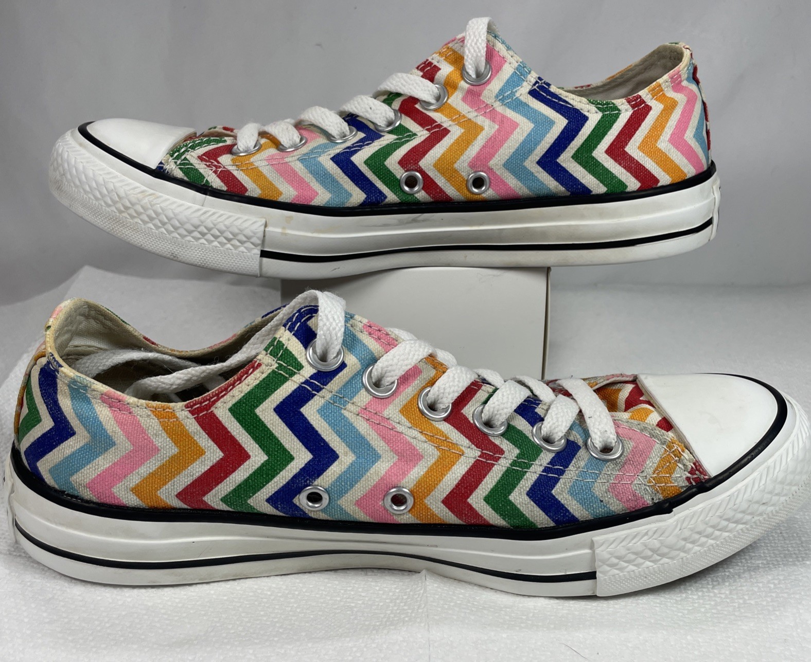 The product is a pair of Converse Chuck Taylor All Star sneakers in size men's 6, women's 8. These lace-up shoes are made of canvas with a rubber outsole, suitable for travel and casual occasions. They feature a multicolor design and come in standard width. The unisex sneakers have a textile lining and foam insole for comfort. With the iconic Chuck Taylor character and multicolor theme, these shoes are a stylish and versatile option for everyday wear. Made in Brazil, they are part of the Converse Chuck Taylor All Star product line.