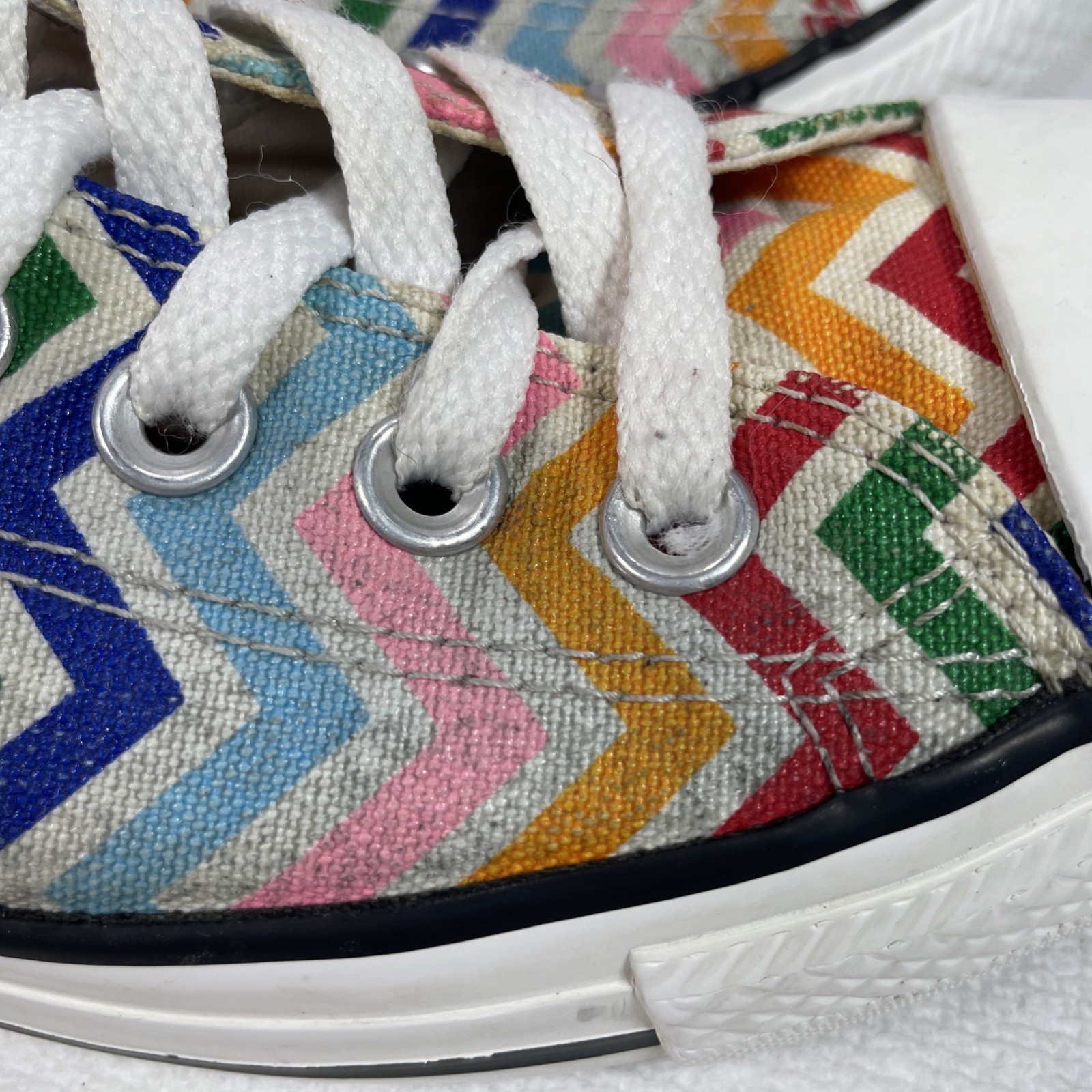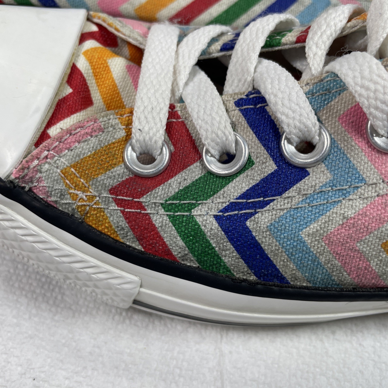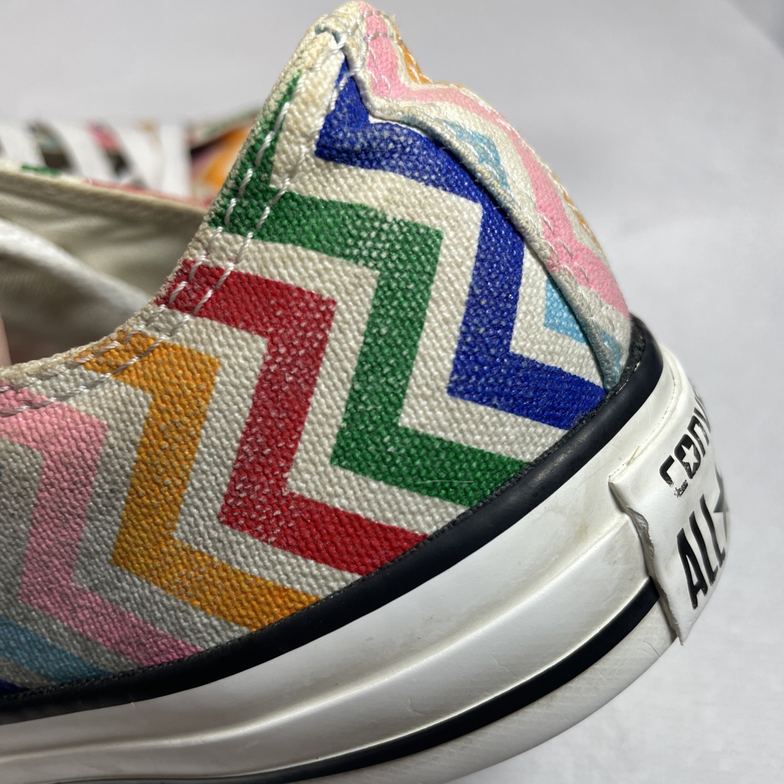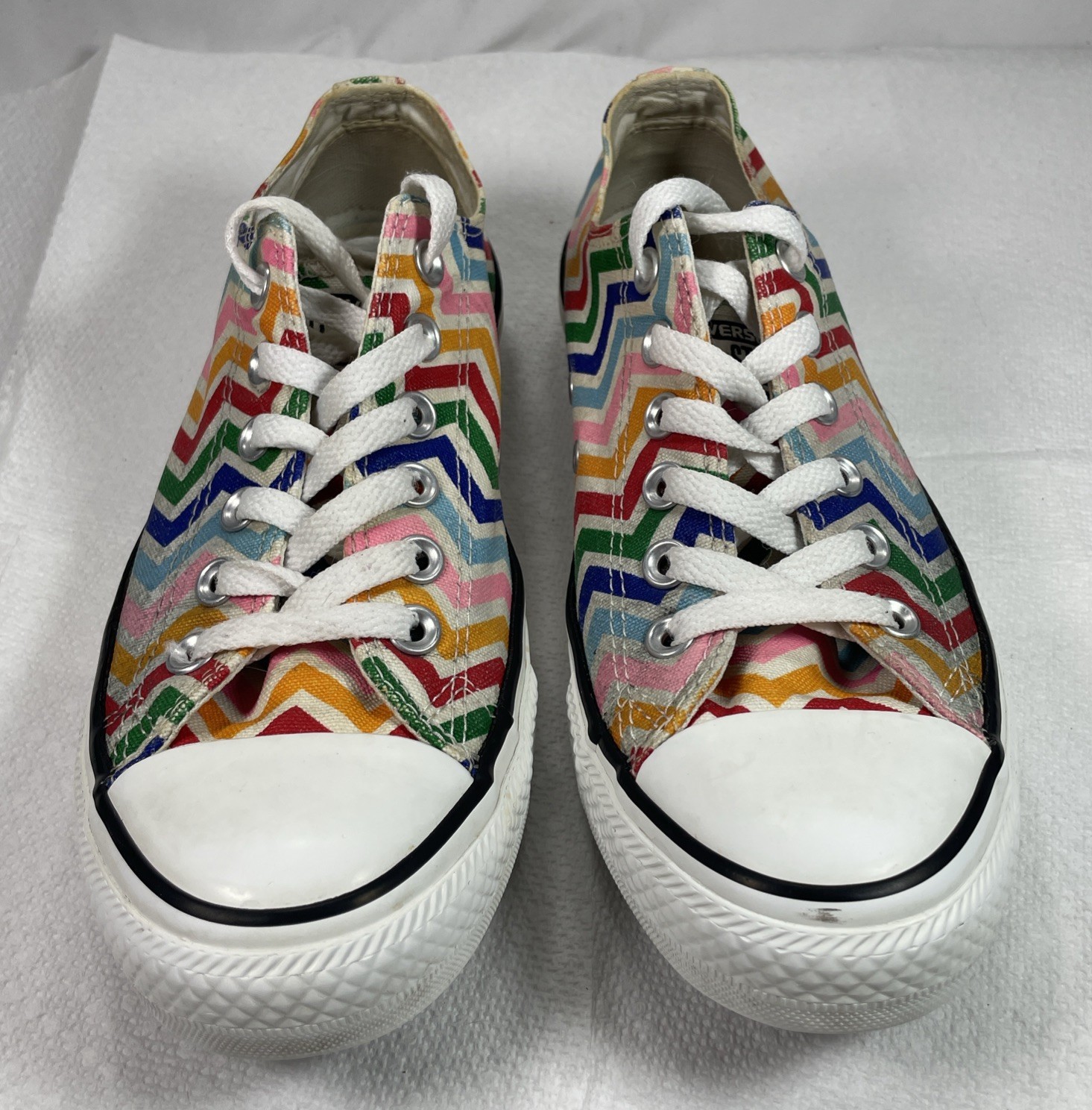 The product is a pair of Converse Chuck Taylor All Star sneakers in size men's 6, women's 8. These lace-up shoes are made of canvas with a rubber outsole, suitable for travel and casual occasions. They feature a multicolor design and come in standard width. The unisex sneakers have a textile lining and foam insole for comfort. With the iconic Chuck Taylor character and multicolor theme, these shoes are a stylish and versatile option for everyday wear. Made in Brazil, they are part of the Converse Chuck Taylor All Star product line.
