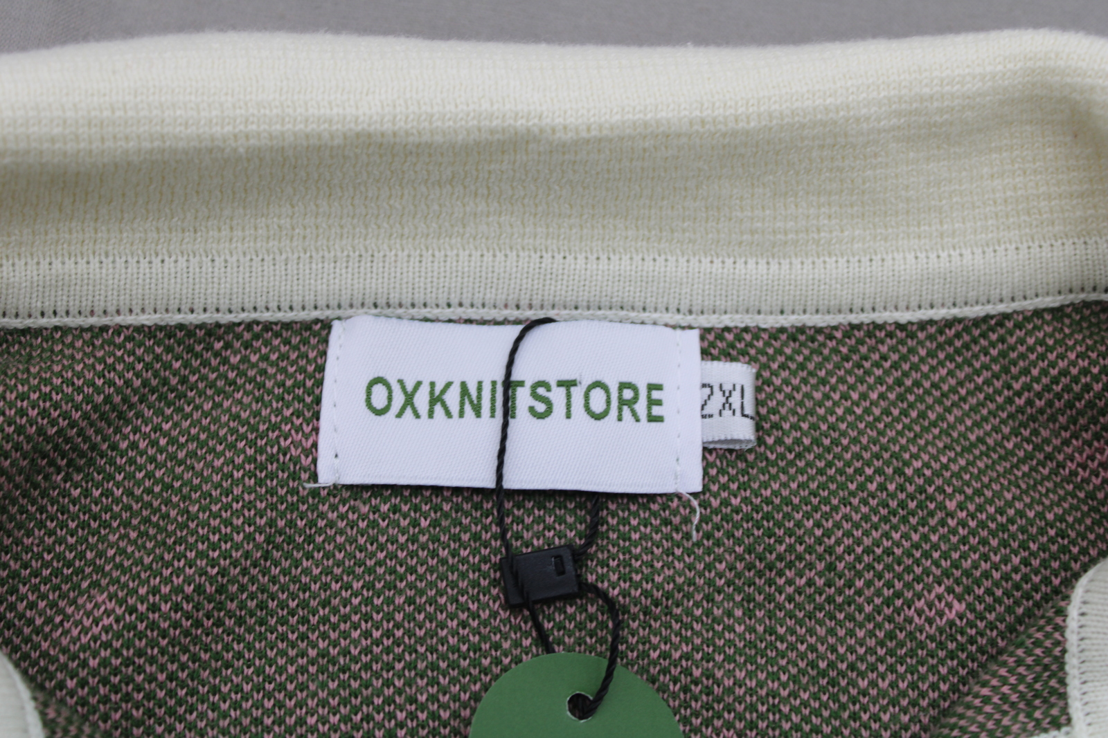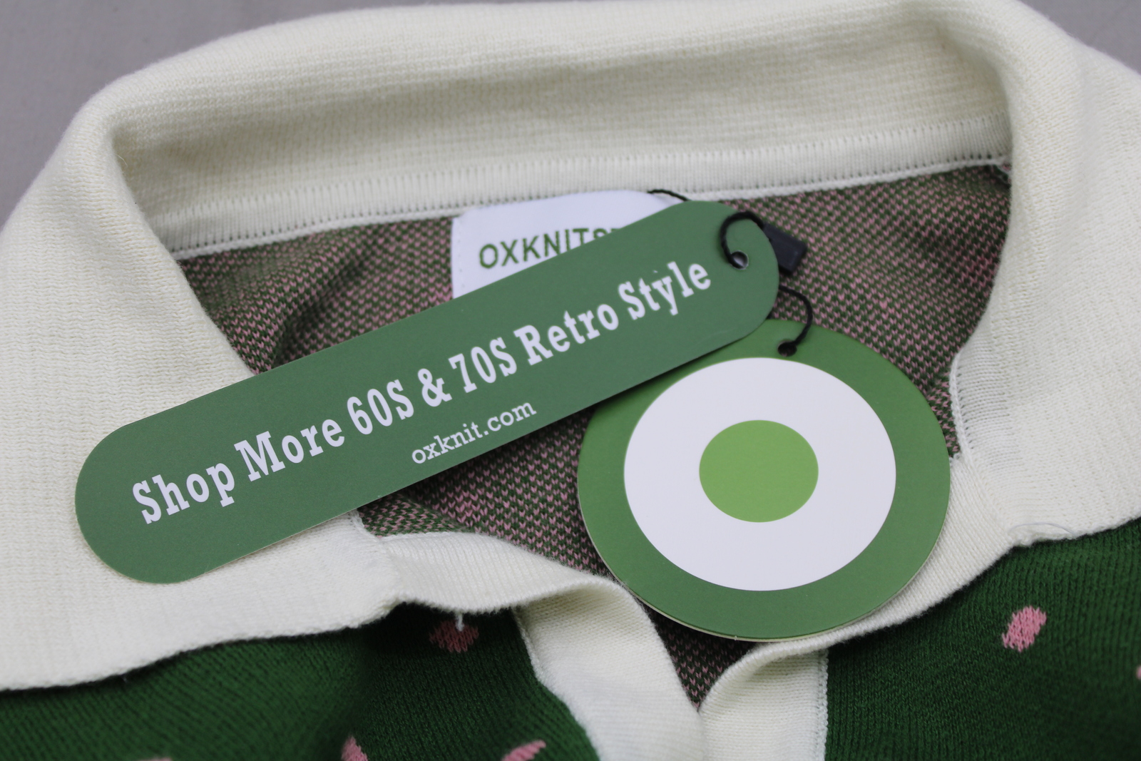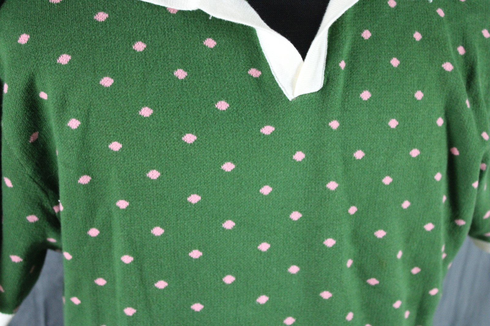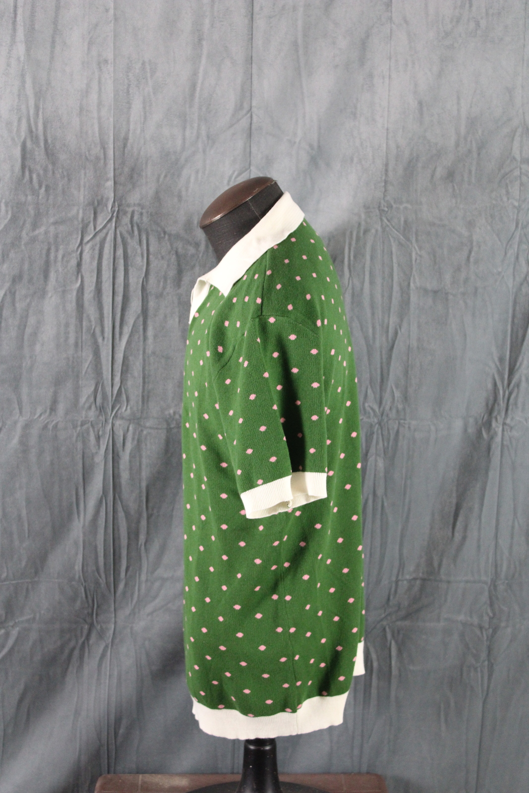 Up for sale is a polo shirt by Ox Knit. It has a green base colour with white trim. The body of the shirt has pink dots woven in. What a great shirt do not miss out on it.