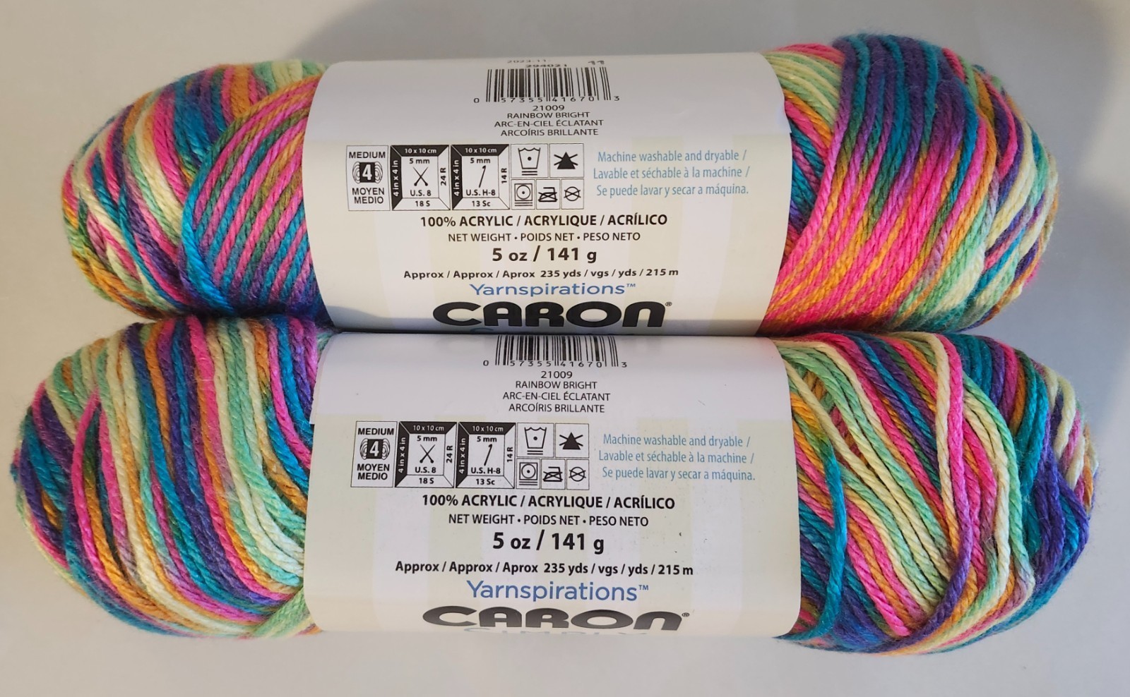 The Simply Soft Paints 2 Yarns in Rainbow Bright Rainbow #21009 by Caron are acrylic yarn skeins in a vibrant multi-color rainbow shade. Suitable for crochet and crafts, these 4-medium weight yarns are easy to work with and care for, as they can be machine washed. Each skein weighs 5 ounces and is made with 100% acrylic material, ensuring longevity and durability in your projects. With the Simply Soft style, these yarns are sure to add a pop of color and creativity to your crafting endeavors.