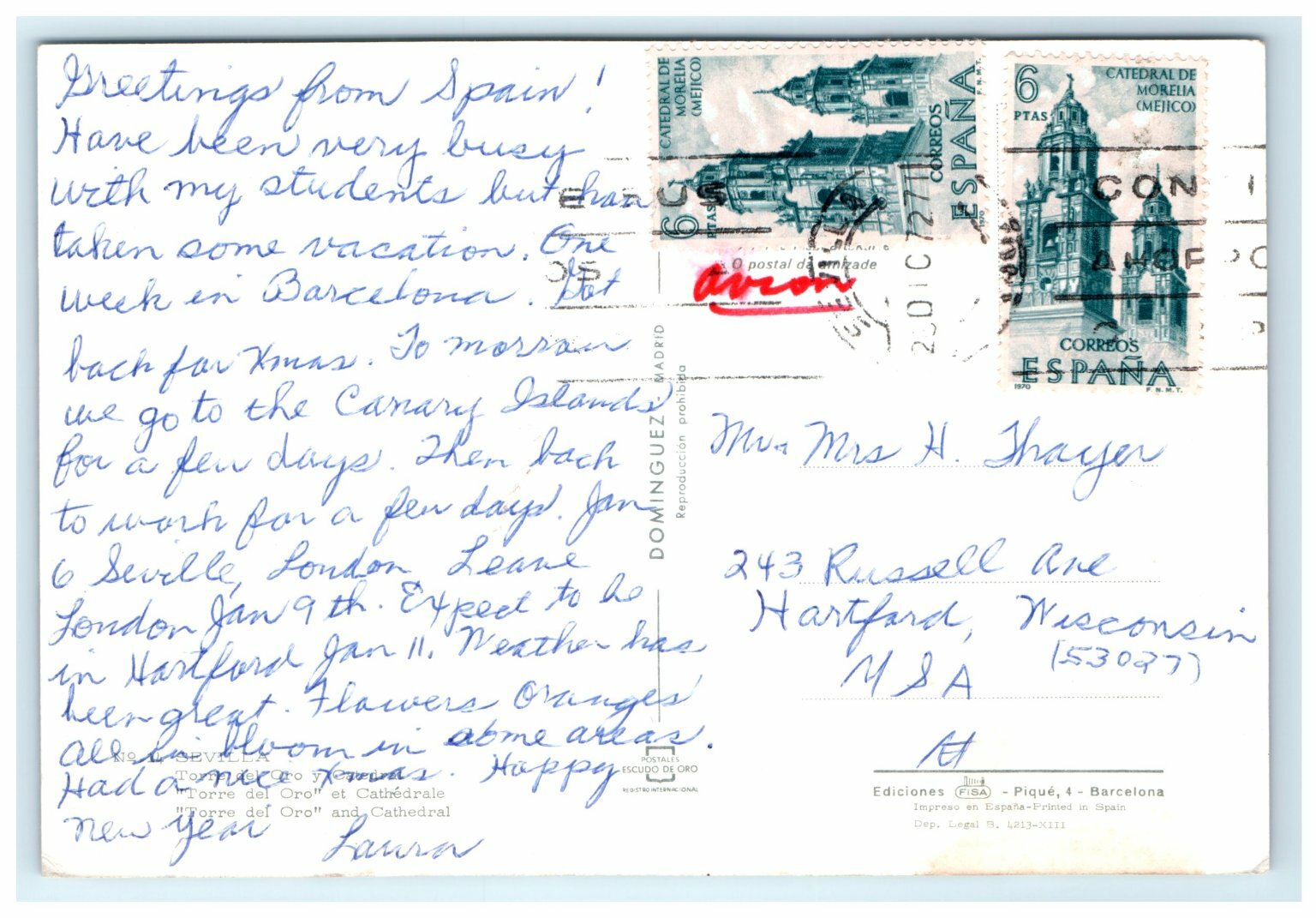 Produced by Ediciones FISA in Barcelona, this continental-sized (6 x 4 in) original printed postcard offers a glimpse into Seville's rich heritage. The card is postally used with Spanish stamps and a handwritten message, adding to its collectible charm. A perfect addition for collectors of European travel memorabilia or fans of Spanish architecture and history.