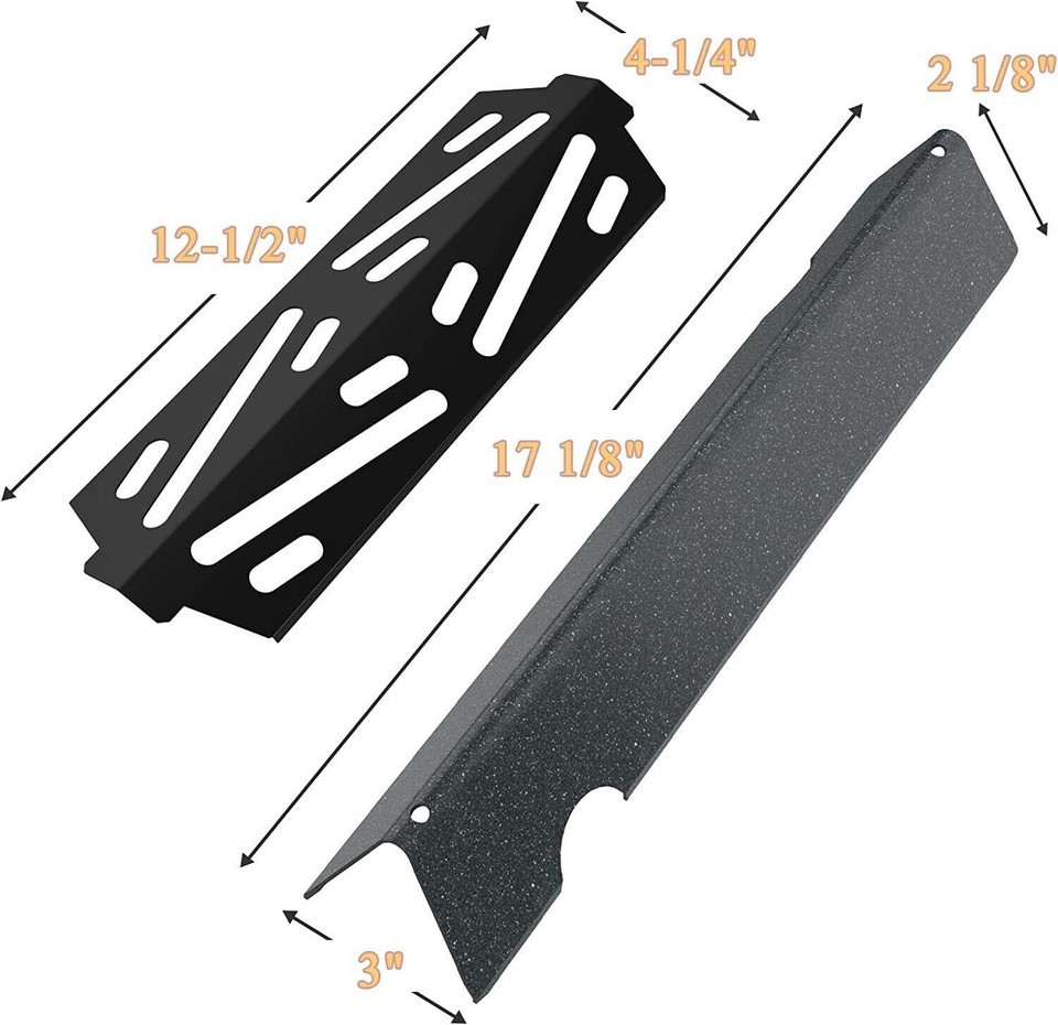 The flavorizer bars measure 17 1/8" x 3" x 2 1/8" (L x W x H) and the heat deflectors measure 12-1/2" x 4-1/4" (L x W)