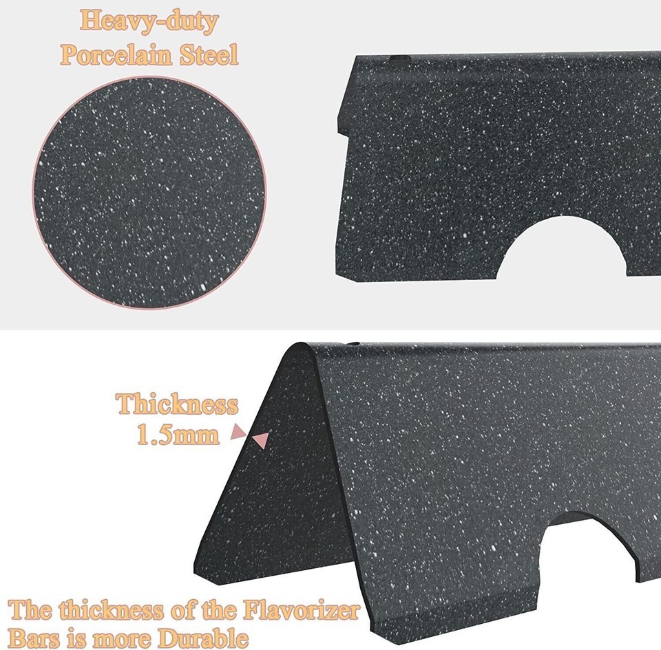 The package includes three flavorizer bars and two heat deflectors, all made of heavy-duty porcelain enameled steel for durability and corrosion resistance