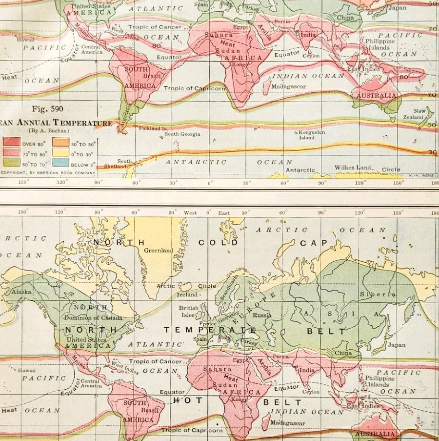 1920 World Map Annual Temperatures Heat Belts Isothermic Lines Vintage DWQ5