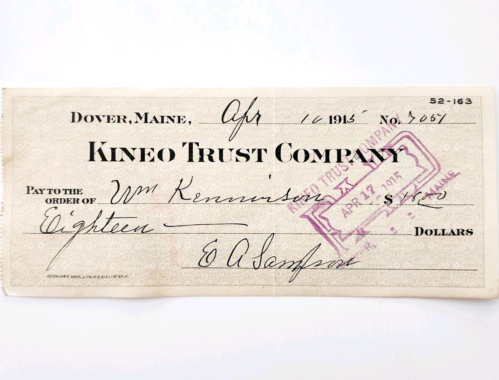 1915 Kineo Trust Company Bank Check E.A. Sampson Dover Maine Signed 7057 CHX15