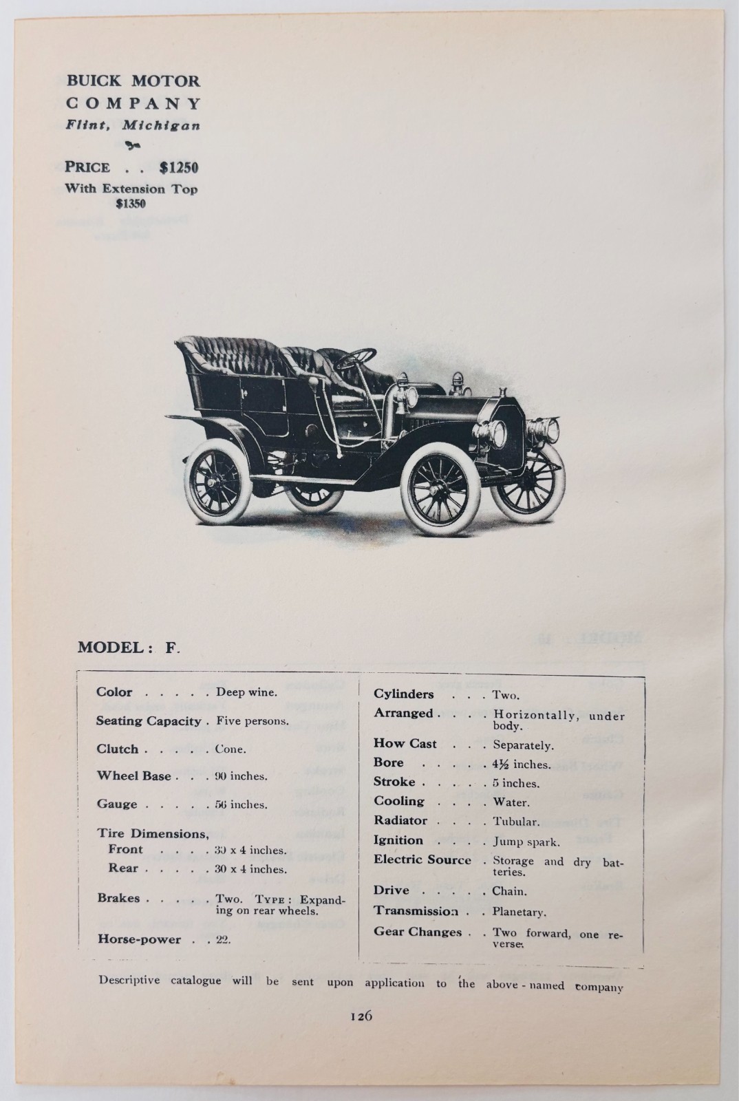 1908 Buick Motor Company Model F Print Catalog Advertisement Automobilia F17M1