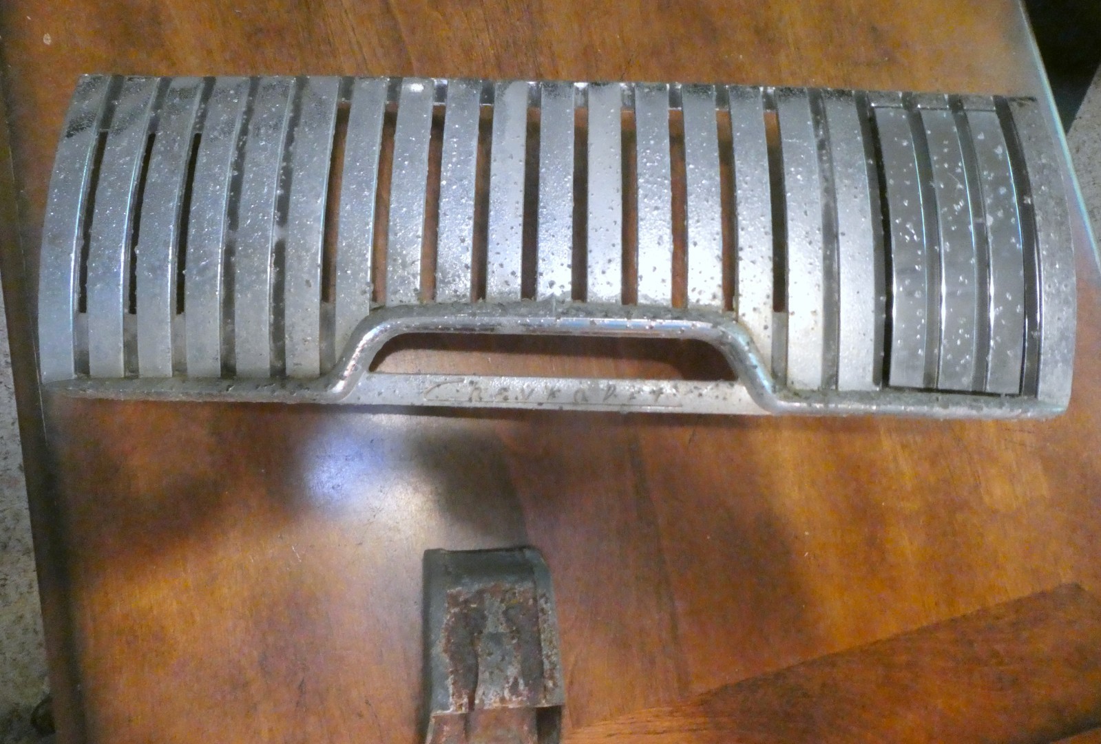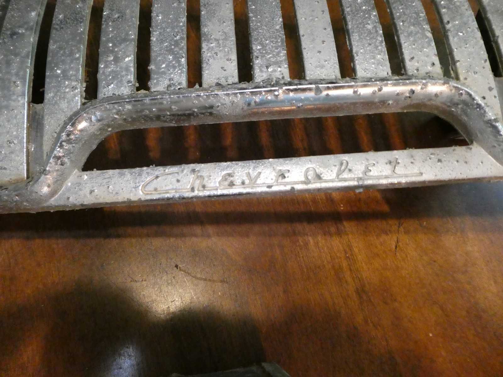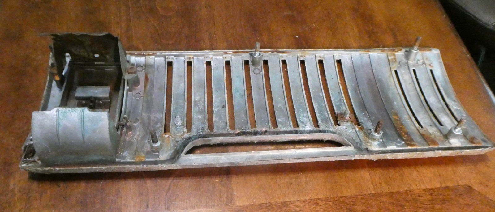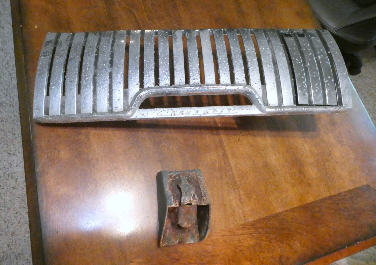 original 1951-52 Chevy Center Dash Trim / radio Speaker Grille w/ Ash Tray, substantial pitting of chrome, rust on the ash tray metal, rust on some of the studs, one side of the ashtray mounting clip is damaged., one of the studs is missing