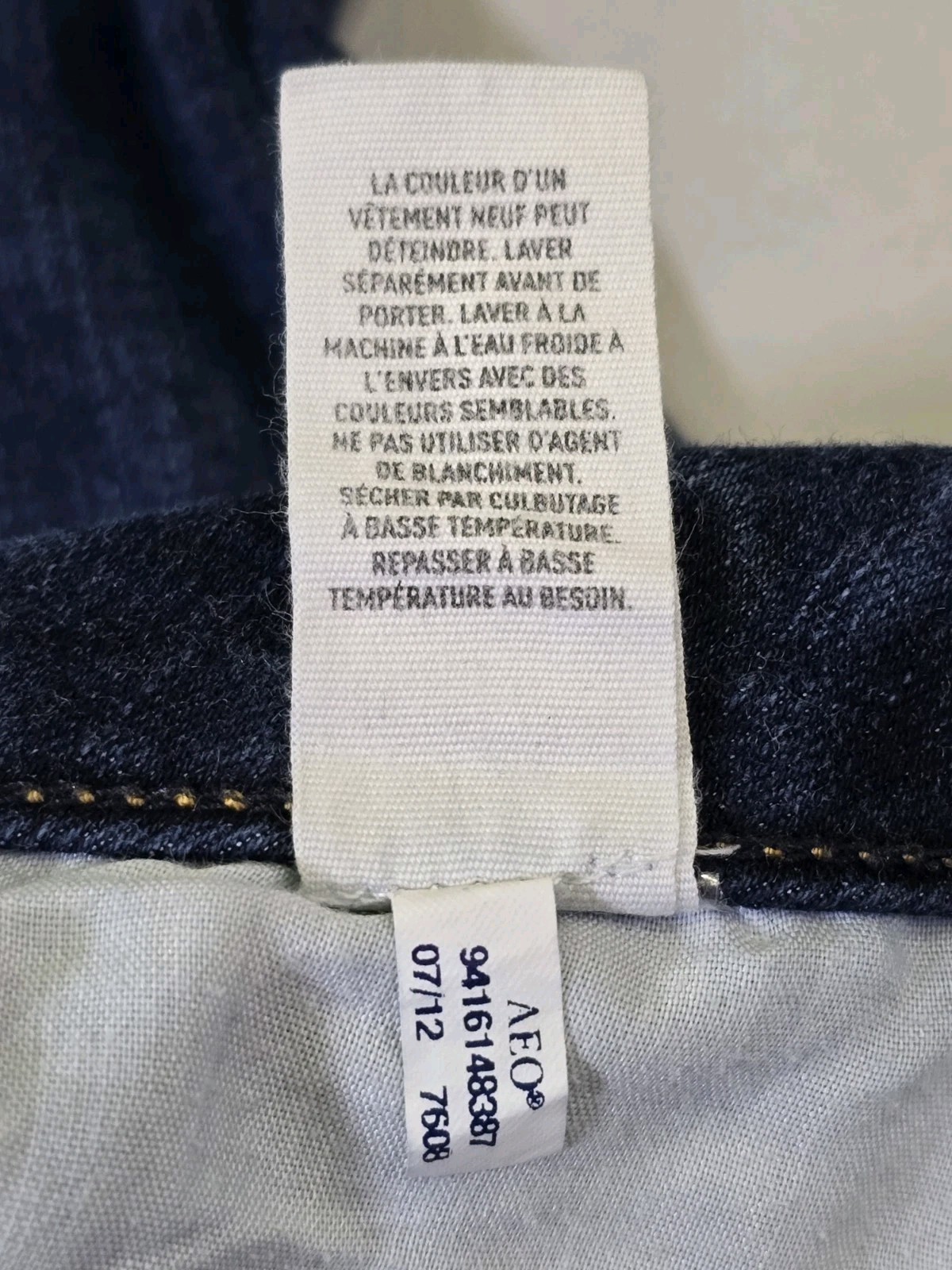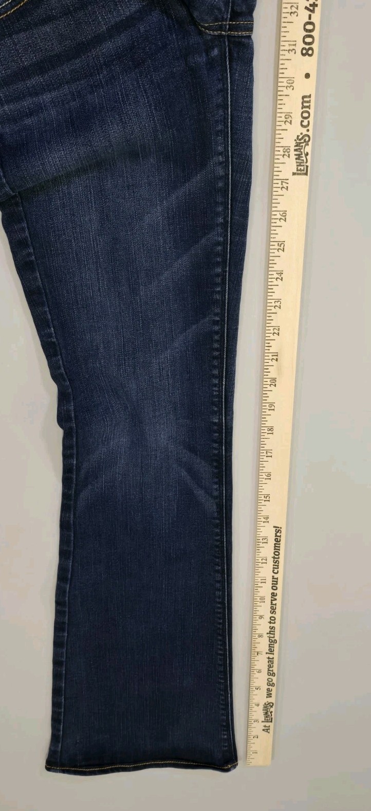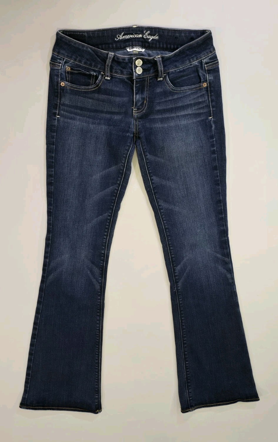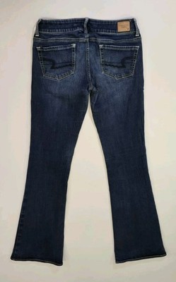 Please see all photos including third photo showing stretching at crotch area. The product is a pair of American Eagle Women's 4 Regular Flared Hippie Stretch Jeans in a size 28x31.5. These denim jeans feature a low rise with a 5-pocket design and come in a dark wash solid blue color. The flared style and stretch fabric offer comfort and a trendy look, perfect for any season. With a zip and button closure, these jeans are easy to wear and care for with machine washable instructions. The design accents include logo detailing and a hippie, bohemian theme. Made with a blend of polyester, spandex, viscose, and cotton, these jeans by American Eagle are a stylish choice for everyday wear.