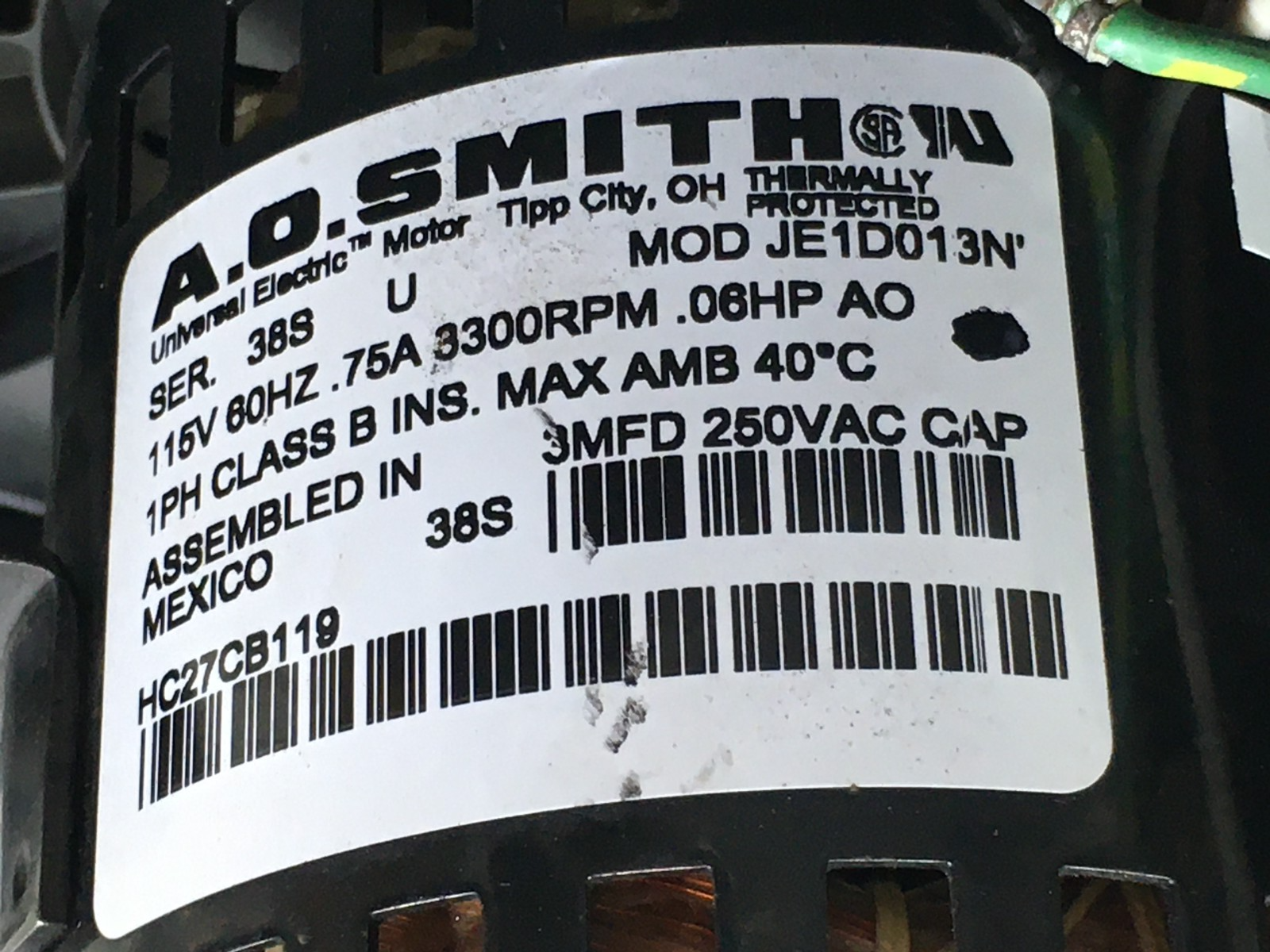 This is A.O. SMITH JE1D013N Carrier Bryant Draft Inducer Blower Motor HC27CB119 115V 3300 RPM .06HP used part.