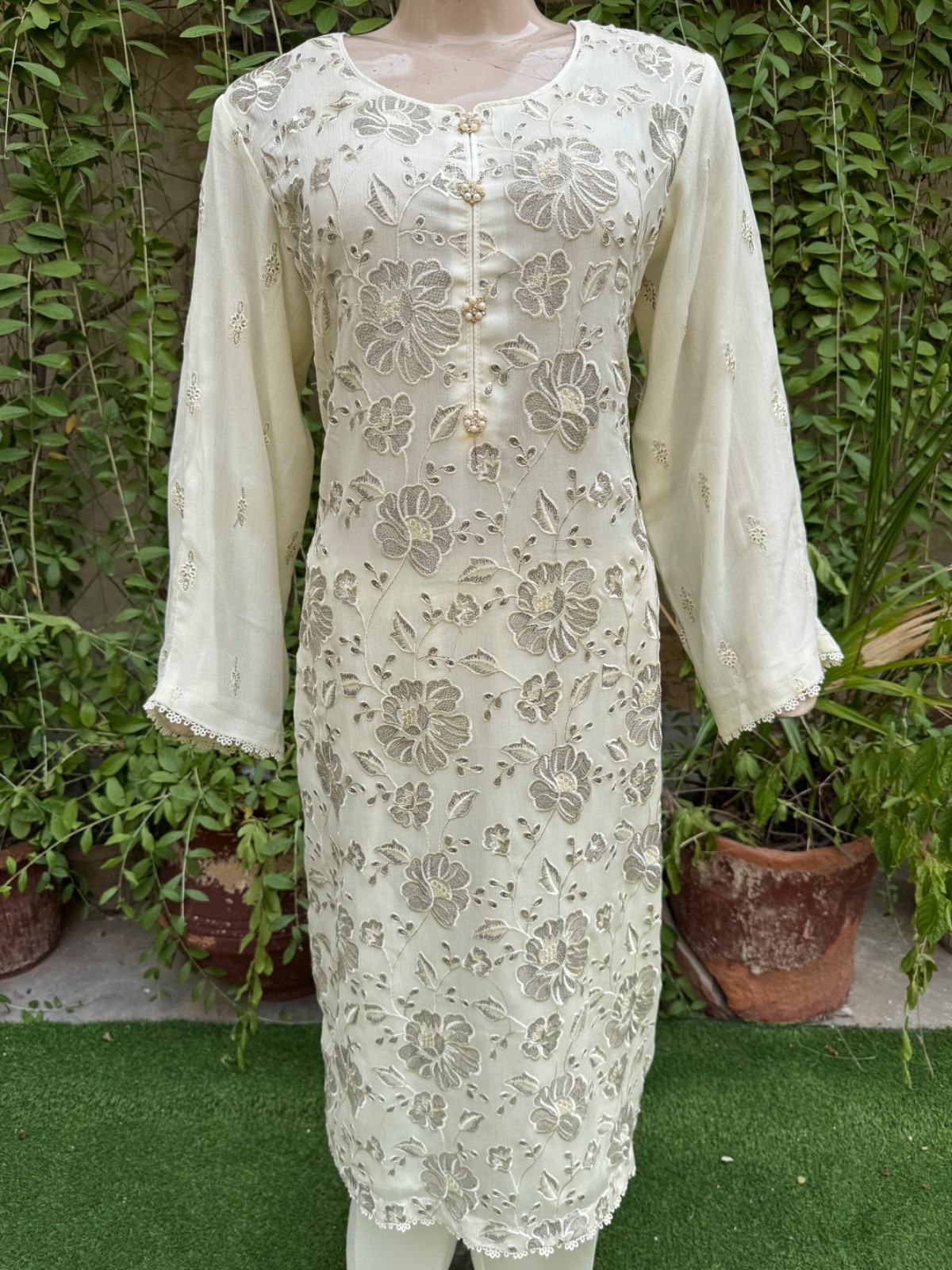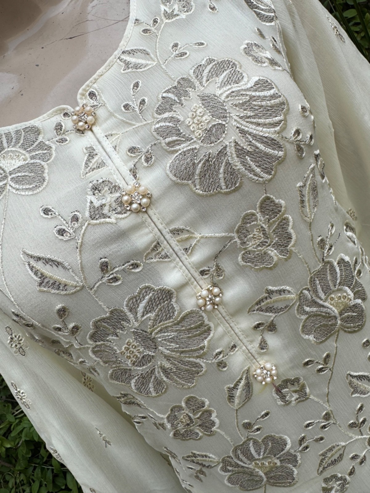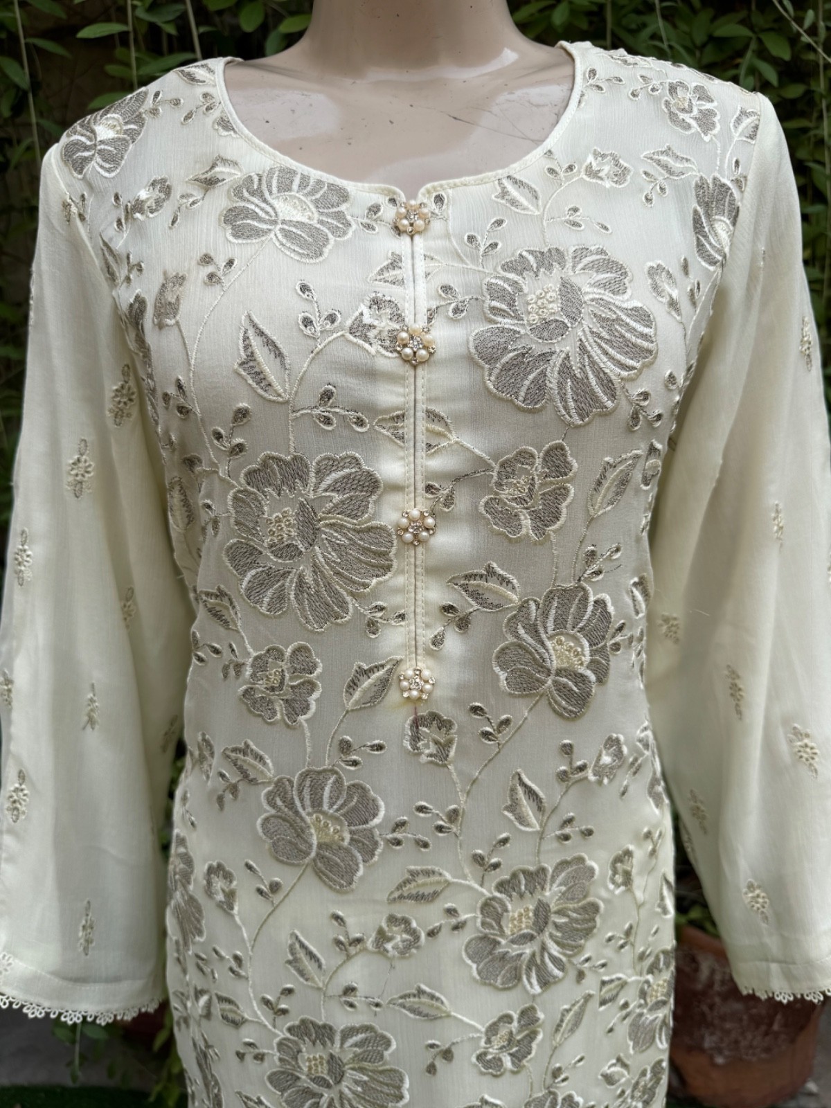 ? Off White chiffon straight style shirt with thread embroidery ,embroidered shirt front and back.