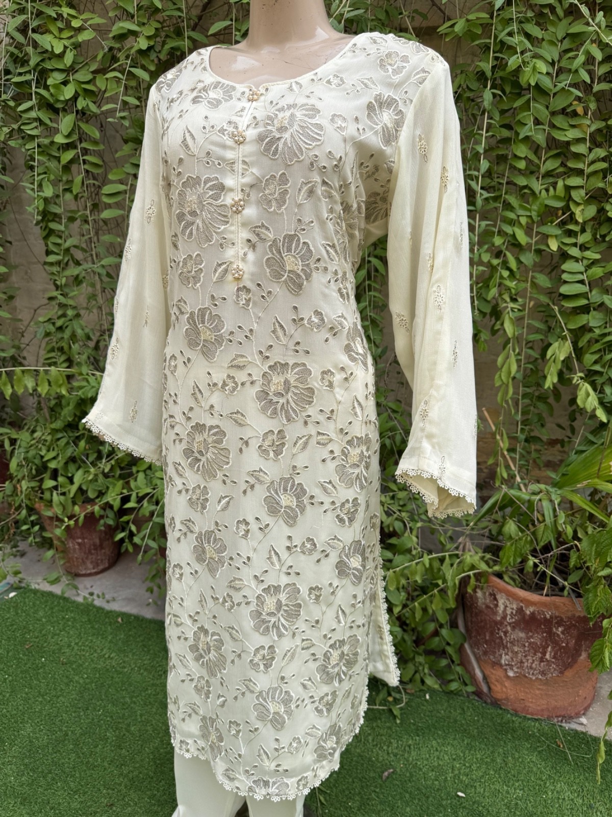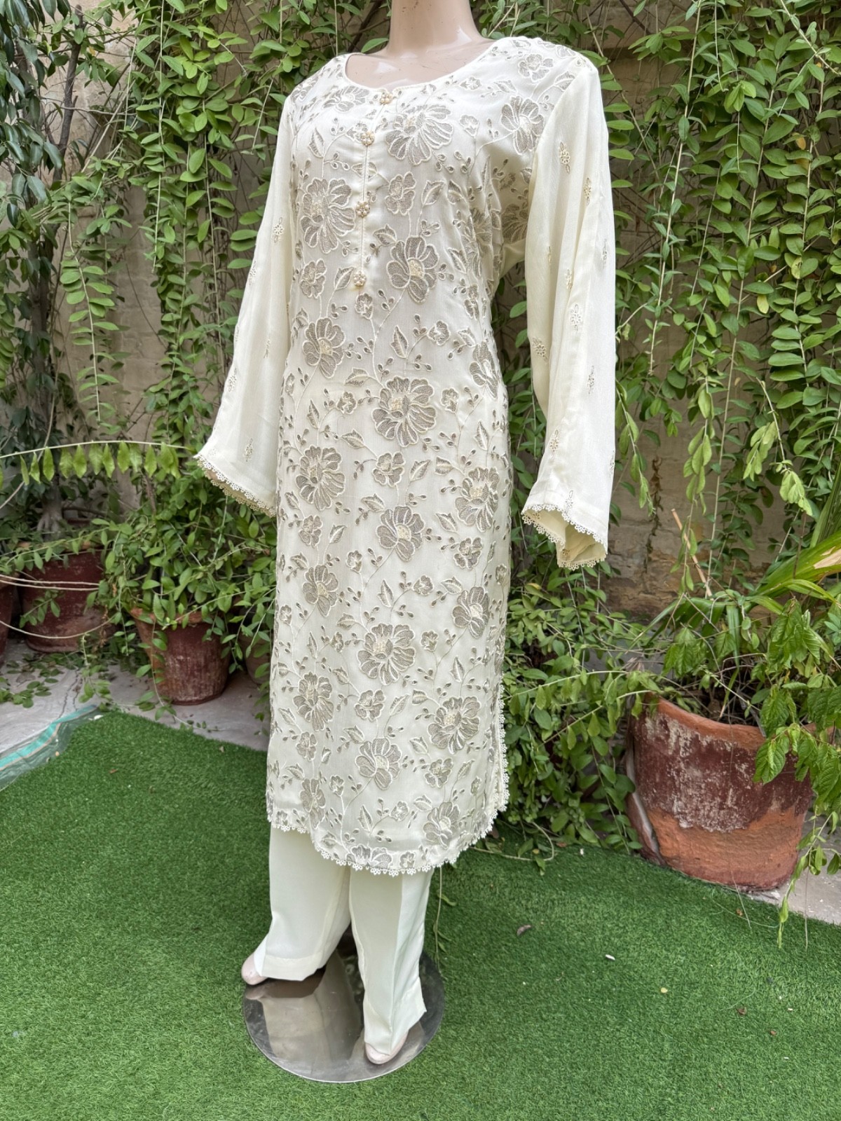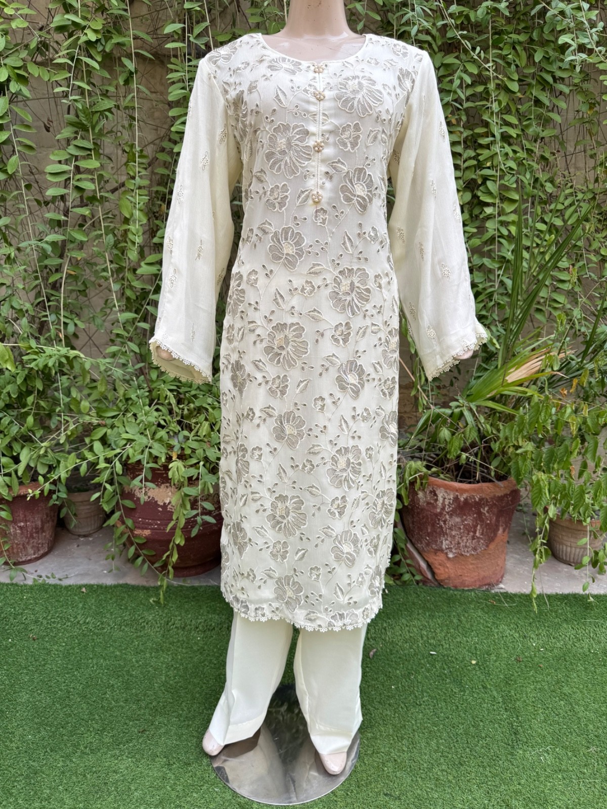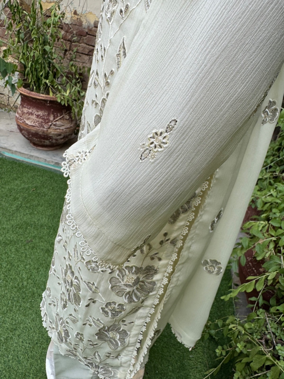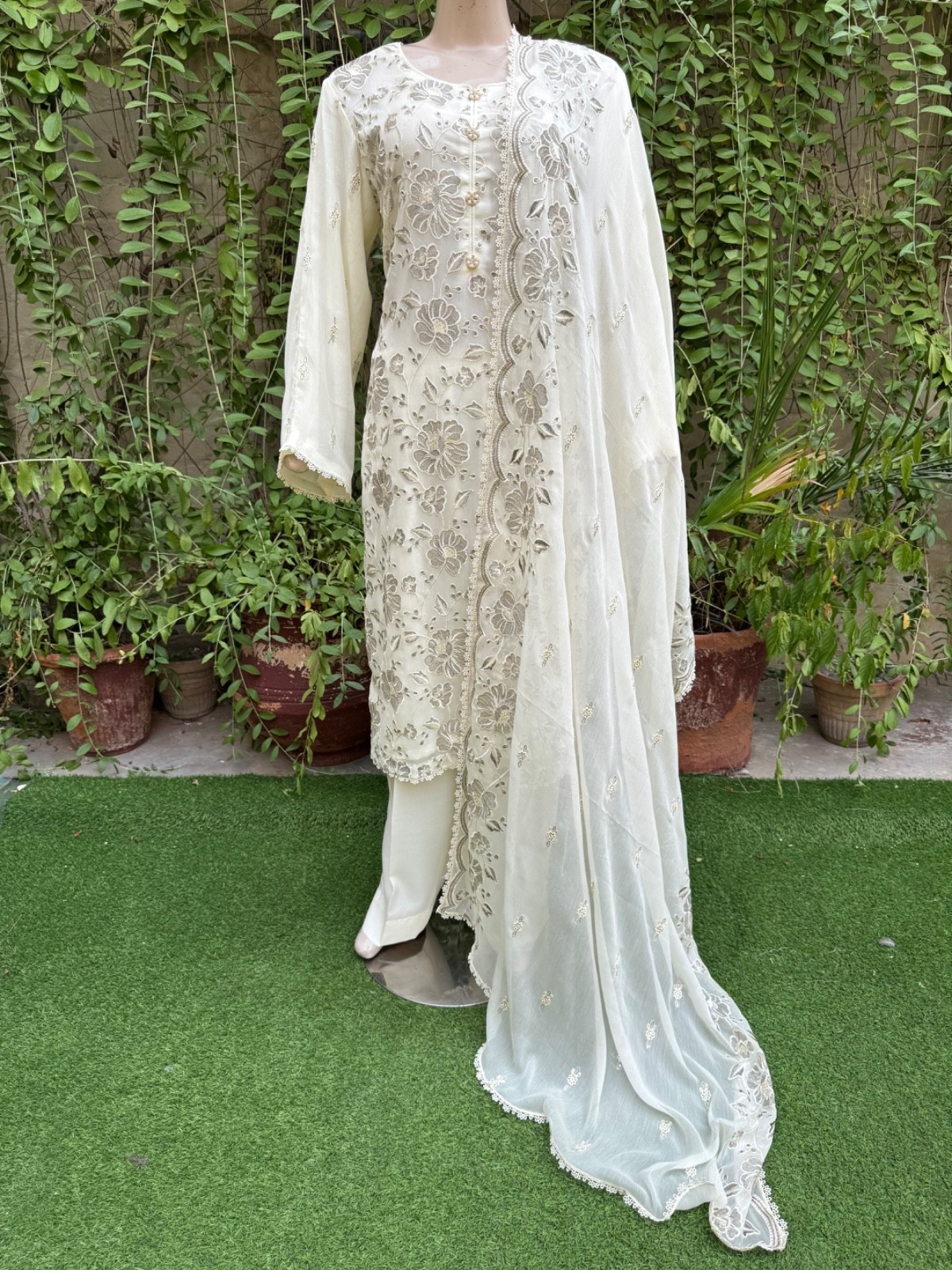 Pakistani Off White 3Pcs Fancy Chiffon Dress with thread embroidery ,XL