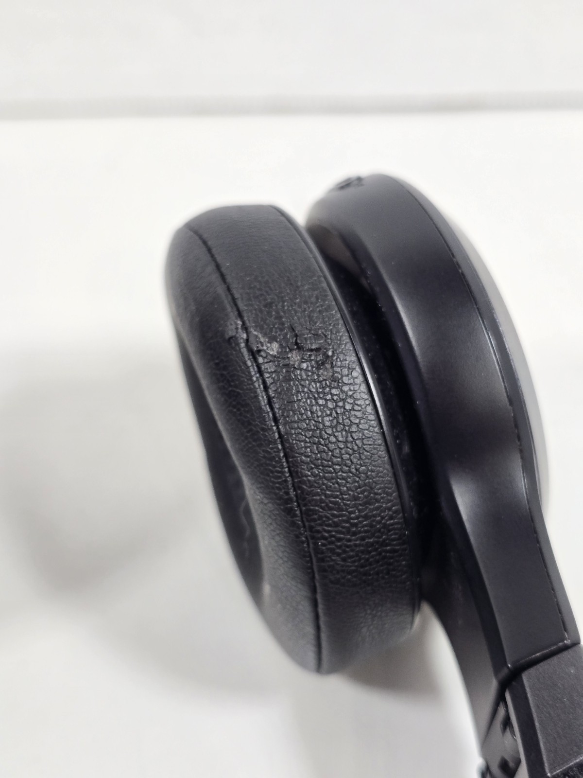 Pre-owned / the pairing button doesn't press. The headphones still Bluetooth to device. Once powered on, just wait a few seconds, and headphones will go into pairing mode. All the functions work, and the cosmetic condition is good. One earpad has some peeling material: see pics