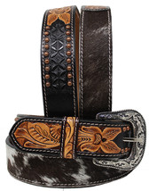 Challenger western 1-1/2" wide belt made from genuine full grain cow leather. Belt is accented with hand tooled floral tooled studded leathers, and a cowhide inlay center. Cowhide is a natural product, each belt may vary slightly in shading, or color making each unique. The included engraved silver buckle is removable and can be swapped out for a buckle of their choice.