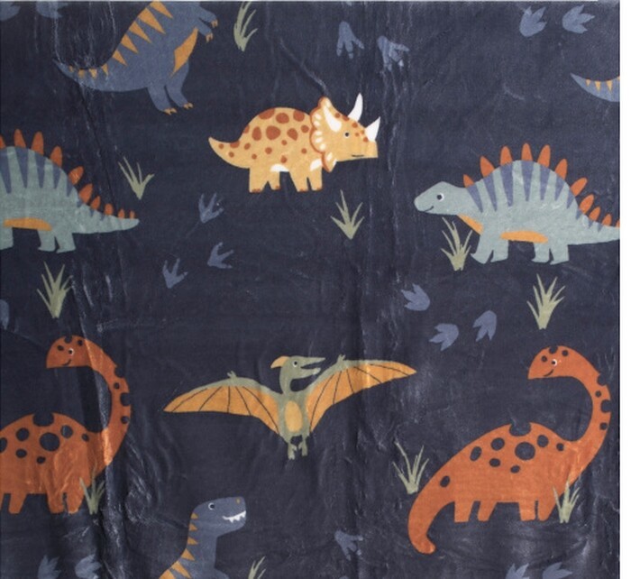 Features a super soft, plush minky fleece blanket in navy blue with a fun and colorful Dinosaur print throughout.
