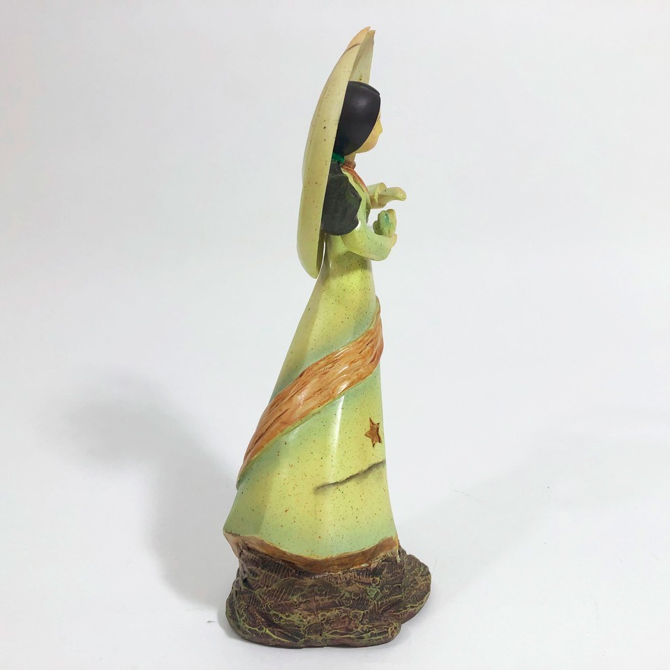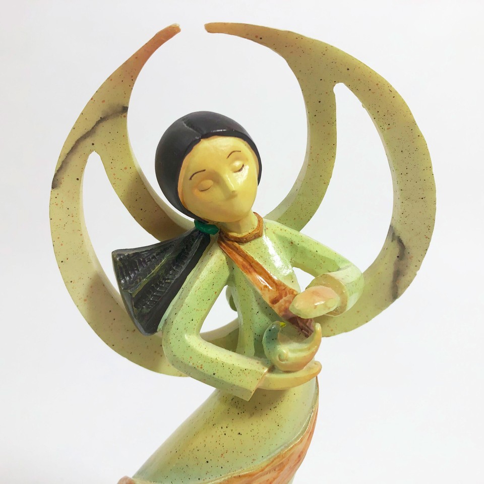 This is an EUC, Excellent Used Condition, contemporary style angel holding a bird in her hand. She is standing on textured looking ground. Her wings are uniquely curved. The way she is standing gives you a sense of a passing breeze. The tiny bird in her hand has a detailed face. The angels' gown is in shades of pale yellow pale green accented with tiny pin dots and 2 stars of brown. Her sash is a golden tan and her hair is a dark brown. Her face shows compassion for the bird. This is a very beautiful piece of art either for yourself or as a gift. No chips, stains or cracks.