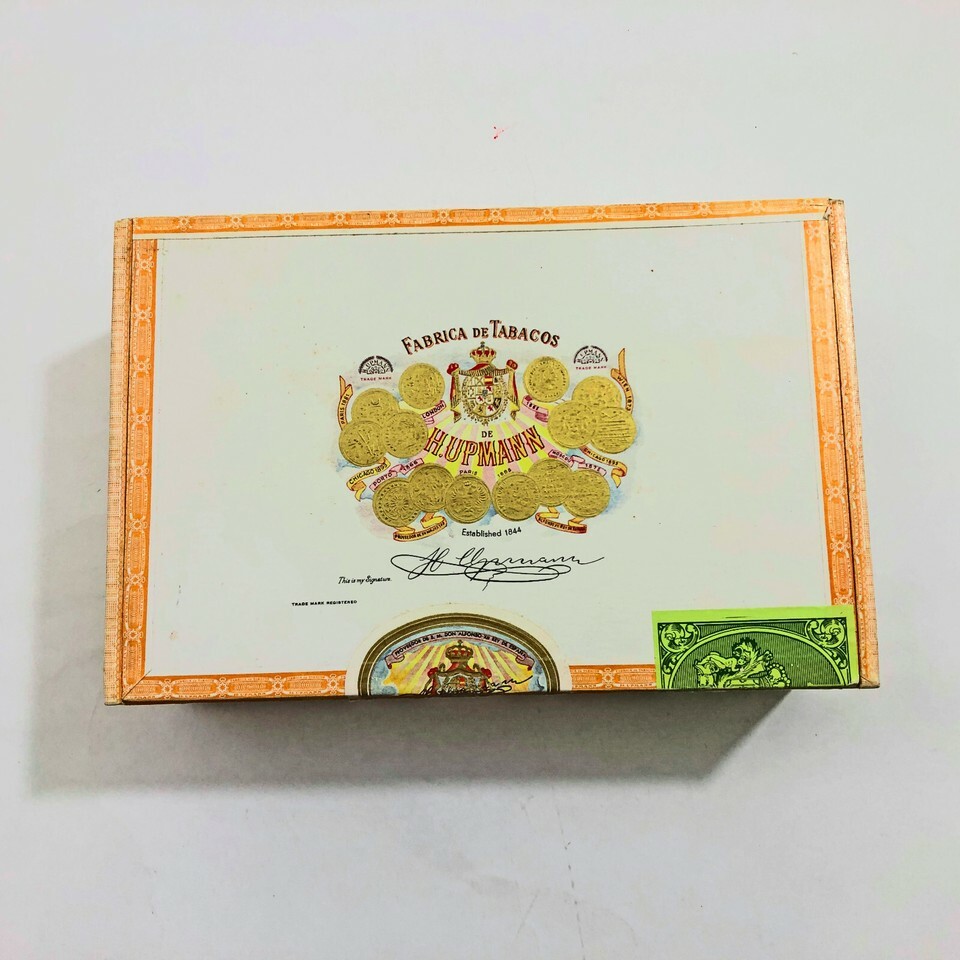 There is a stain inside of the lid on the bottom left side, see the pictures. Inside the box no longer has the paper lining on the bottom of the box. There is one dark brown stain on the bottom of the box. The box's gold tone embossed top adds a beautiful accent as well as recounting the history of the H. Upmann Cigar Company. This box would be a good addition to a cigar box collectors collection or the be turned into a purse.