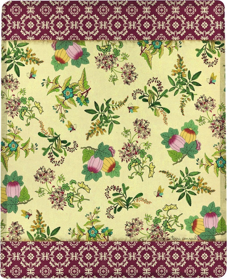 bordered top and bottom with light burgundy floral print, reverses to