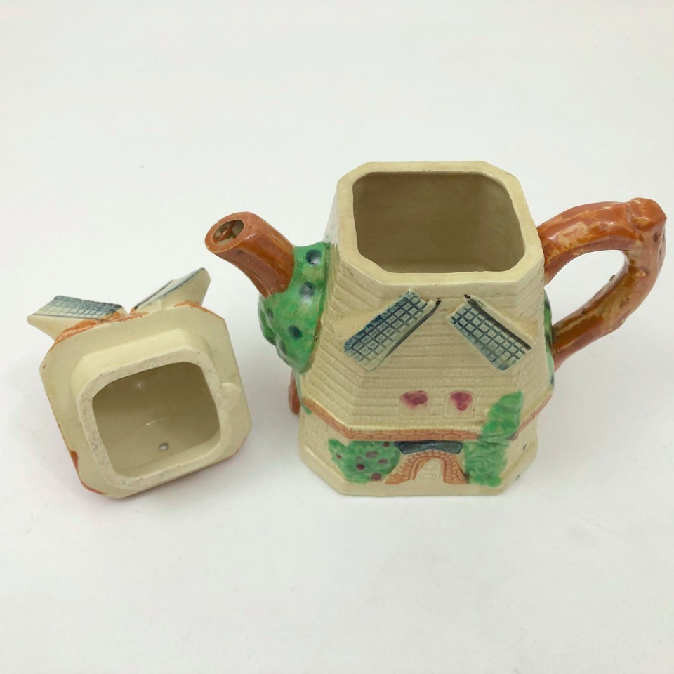 EUC, Excellent Used Condition vintage Dutch Windmill porcelain teapot made in Japan. The teapot's body is a windmill. Made in Japan stamped on the bottom. Made between 1921-1941. The windmill house has windows, a door and green bushes. The spout and handle are a tree branch. The windmill blades are placed two on the body of the teapot and two on are on the roof top. There is a vent hole in the back of the roof.