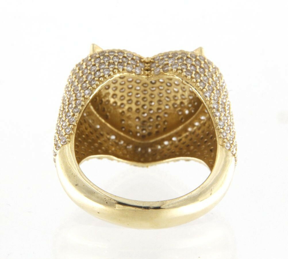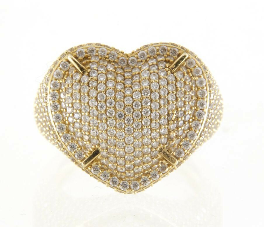 Type: Fashion RingWeight: 7.4Karat: 10ktMetal: Yellow GoldGender: UnisexStyle: HeartSize / Length: 11Owner applied: 10K CALStone 1 quantity: 550Stone 1 shape: RoundStone 1 color: ClearStone 1 weight (total): 5.5Stone 1 type: Cubic ZirconiaCondition:Used