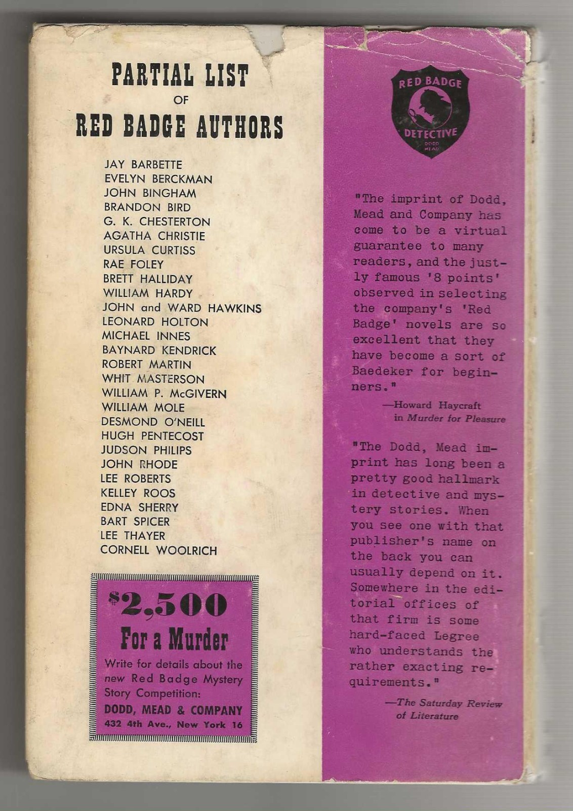 Upper and lower spine edges and corner tips lightly rubbed, very mildly bumped to the upper shelf-edge, else tight, square, firm and very good in polished cream-gray linen boards with dark-blue Red Badge Detective insignia to the front cover and with dark blue insignia and titles to the spine, sewn binding; in an about very good rubbed dust jacket with mild soil stains and grey foxing dots, yellowing to the spine panel, a chip and creases to the upper rear panel, and chipping to the upper and lower spine ends; original printed $2.95 price still intact to the front inner flap.