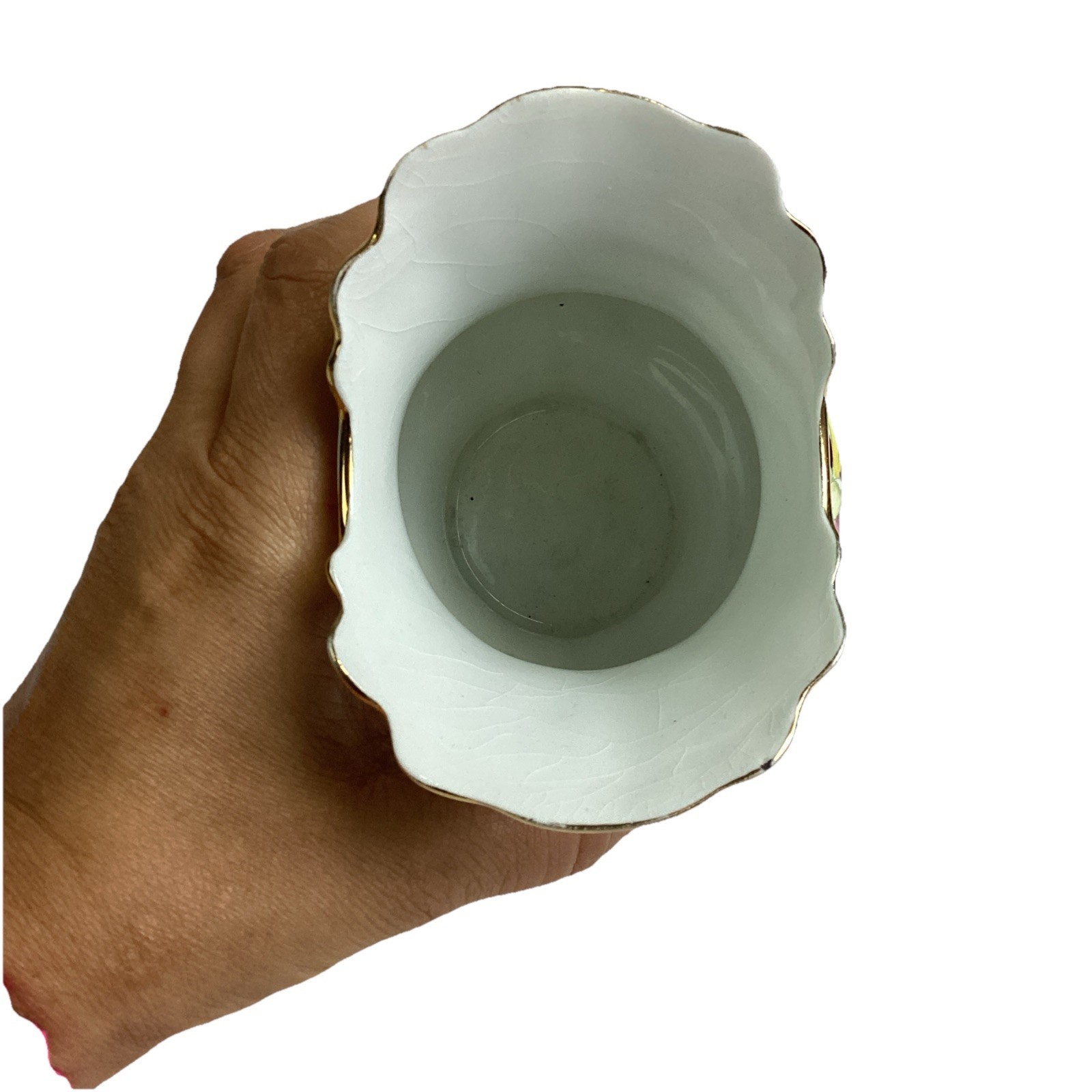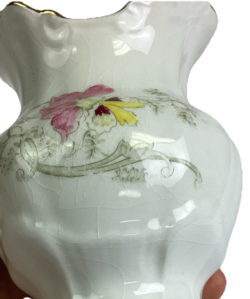 Vintage Homer Laughlin Floral Crackled Ceramic Porcelain Vase W/ Gold Trim. In mostly good condition. There is slight color loss on the edges and a few small stains. Also noticed a very small chip on the top edge which can be seen in the pictures. This measures 3.75x2.75x5?