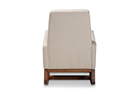 Inspired by mid-century modern design, the Roana rocking chair has blended the retro feel of a vintage upholstered rocking chair with the quality, made-to-last design you'd expect from a modern piece of furniture. The result is our exclusive Roana Rocking Chair. Featuring polyester fabric in light beige and a sturdy wood frame in a beautiful walnut finishing, this retro rocking chair feels right at home in a nursery, living room or any shared space. High back contoured design and ergonomic arm height add more charms to this piece. The Roana looks smart, modern, but comfortable can be a good rocking chair for nursery during middle of the night feedings and yet a pretty piece of furniture to accent the room. Made in Malaysia, the Roana requires assembly.