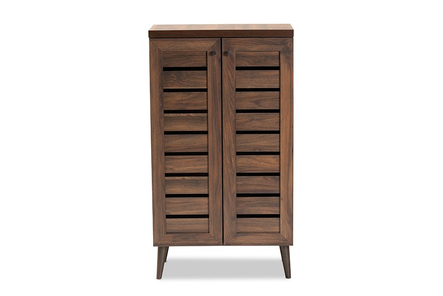 Features: Constructed from rubberwood, MDF wood, and LVL Walnut brown finish Four (4) shelves behind the doors provide space for 8 pairs of shoes Angled legs Slatted wood doors Solid and Quality Construction Set Includes: One (1) Shoe Cabinet