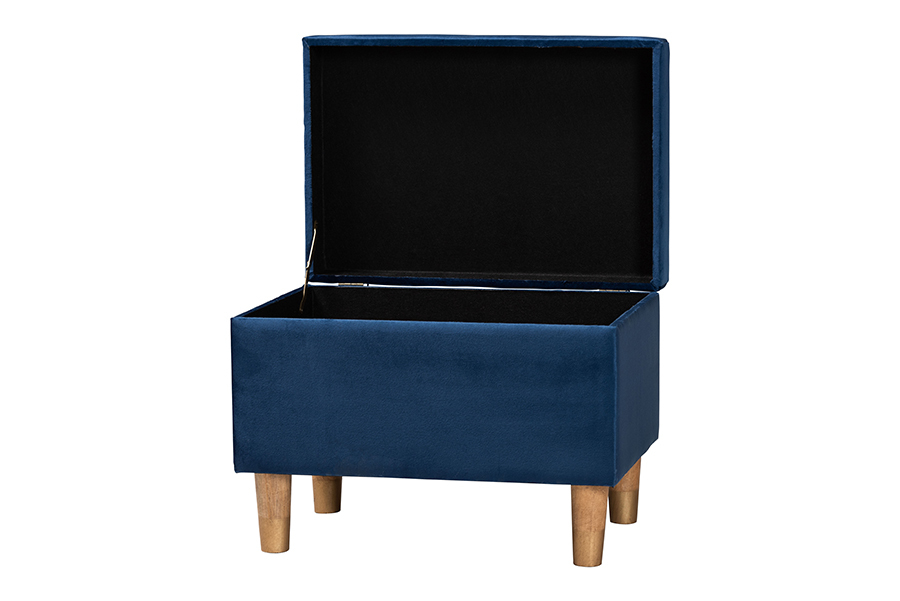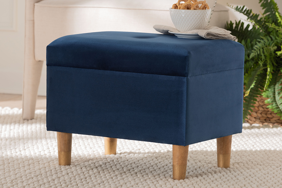 Features: Modern Storage Ottoman Constructed from an Engineered Wood Frame with Firwood legs Lift-top opens to reveal a convenient storage compartment Button-tufted cushion adds classic charm Padded with foam and upholstered in velvet fabric Tapered wood legs provide excellent stability Set Includes: One (1) Ottoman