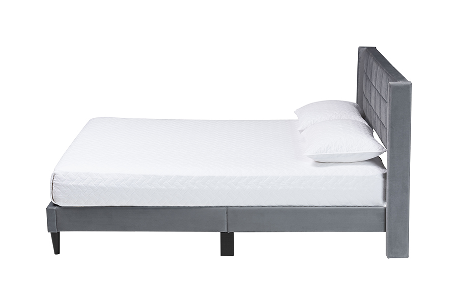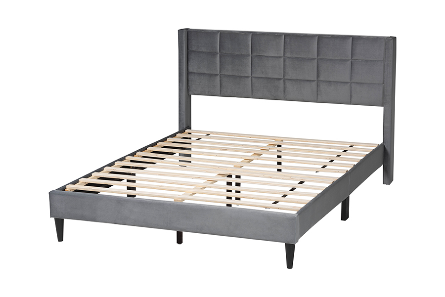 Features: Modern Queen Size Platform Bed Frame constructed from Engineered Wood Biscuit tufted wingback headboard creates a majestic backdrop Padded with foam and upholstered in velvet fabric Tapered legs provide excellent stability No Box Spring Required: Wood slats eliminate the need for a box spring Set Includes: One (1) Queen Size Bed