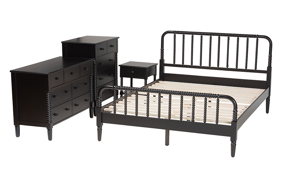 Features: Farmhouse Set Includes One (1) Queen Bed, One (1) Dresser, One (1) Chest, and One (1) Nightstand Constructed from Rubberwood and Engineered Wood Classic spindle embellishments exude geometric allure Slatted wood headboard and accent footboard Round drawer knobs add a touch of timeless elegance No Box Spring Required: Wood slats eliminate the need for a box spring Set Includes: One (1) Queen Size Bed; One (1) Nightstand; One (1) Dresser; One (1) Chest
