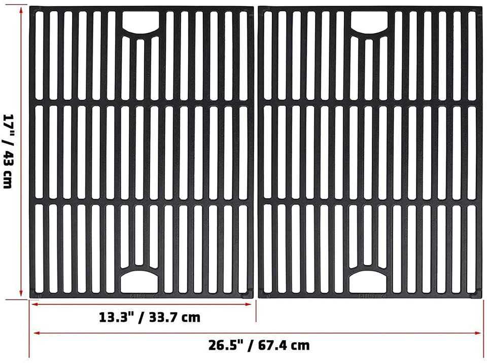 ?Dimension?- 17" x 13 1/4" each, 17" x 26 1/2" total. ?Material?- Matte cast iron. ?Package?- 2 Pack cooking grate. ?Original Part Number?- 341-025, 549-057, 13000123A0, 13000394A0, 55-09-152