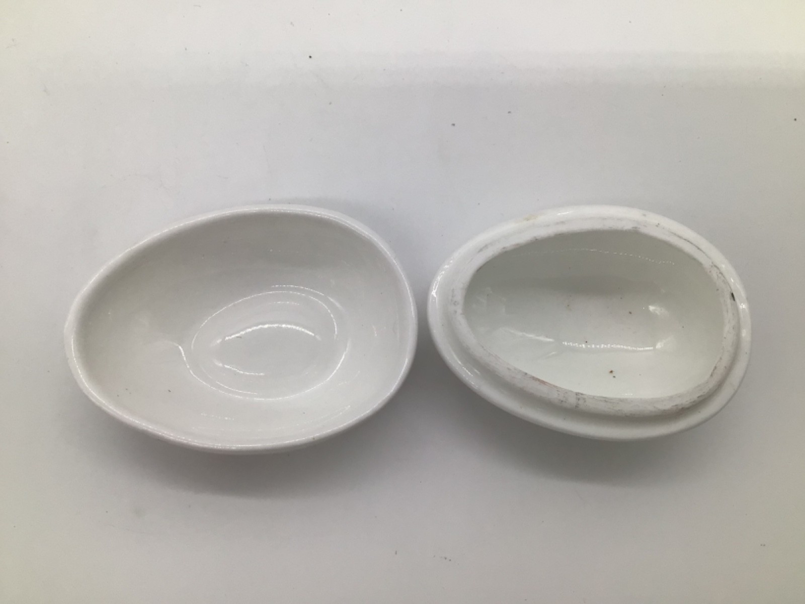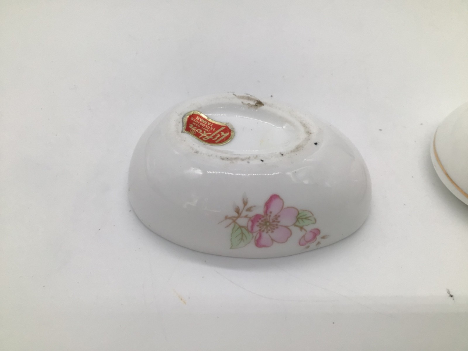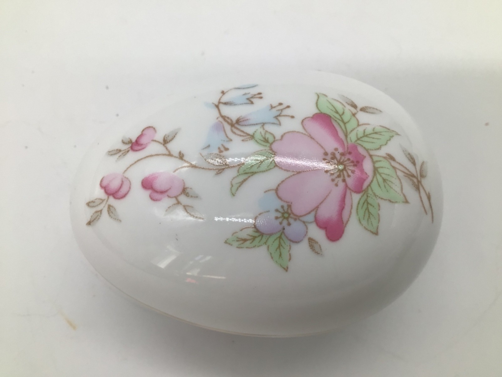 This vintage LEFTON porcelain egg-shaped trinket box features a delicate floral design with soft pinks, greens, and gold trim. Measuring 3 inches long, it is perfect for jewelry, keepsakes, or display in a vintage porcelain collection.