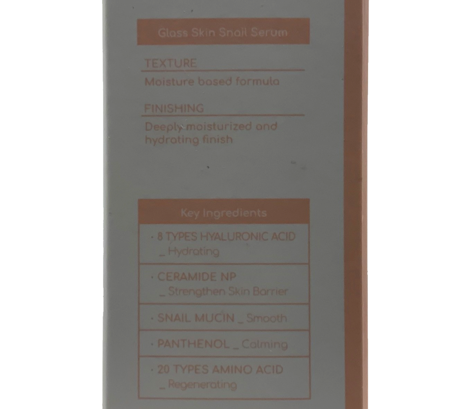 Serum contains snail mucin, mucilage that absorbs nutrients deep into the skin, helping the absorption of amino acids and hyaluronic acid for light and refreshing moisture, creating healthy moisturized, and glowing skin from within.
