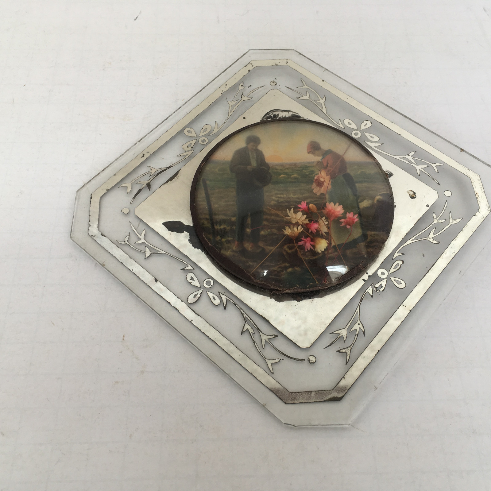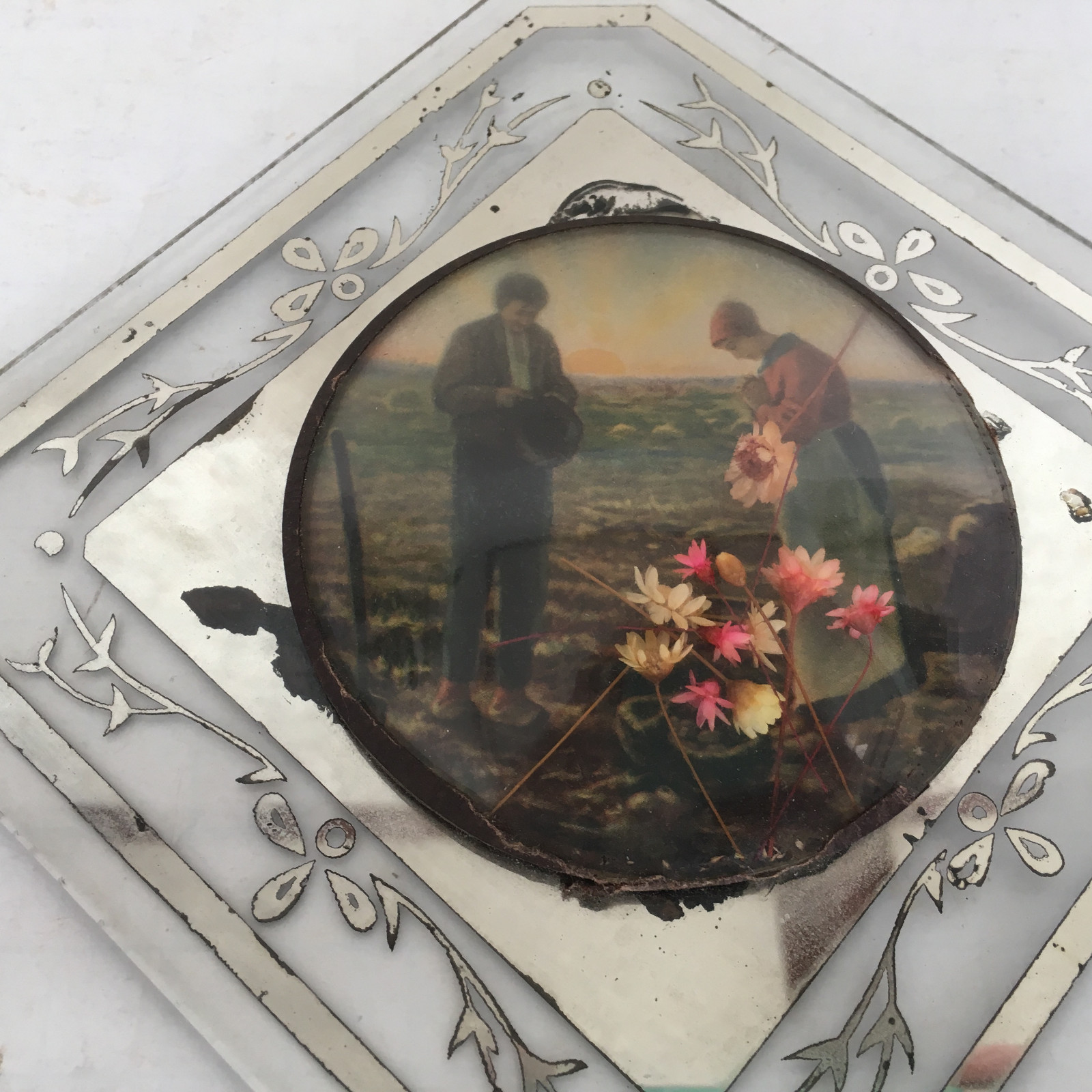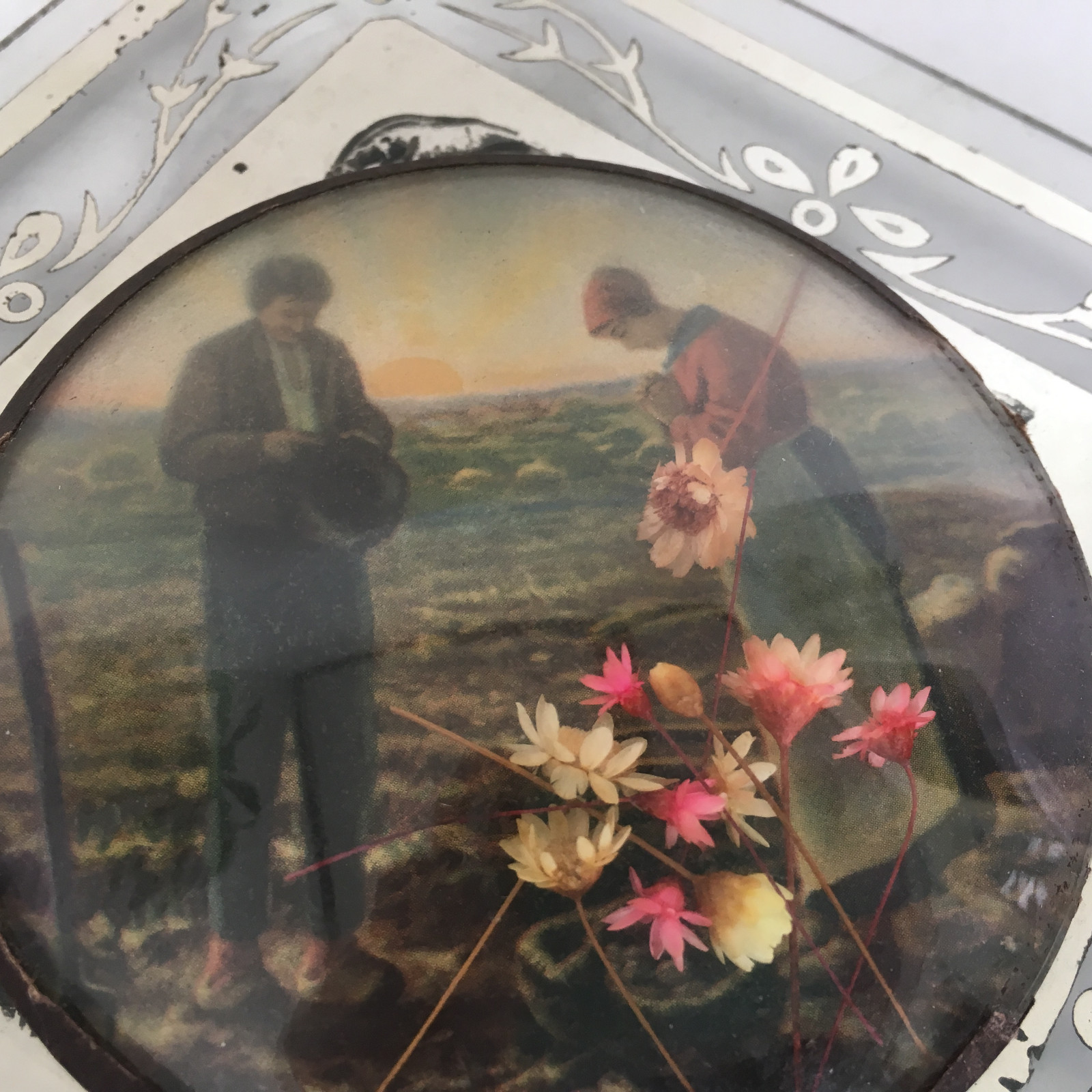 vintage The Angelus print mounted on glass with glass flue dome cover and small dried flowers (see pictures)
