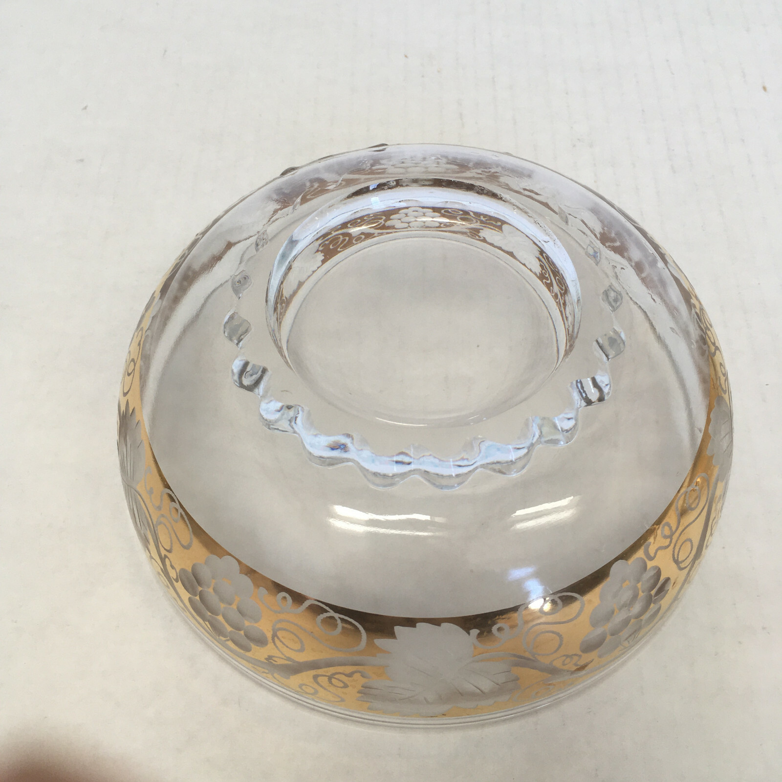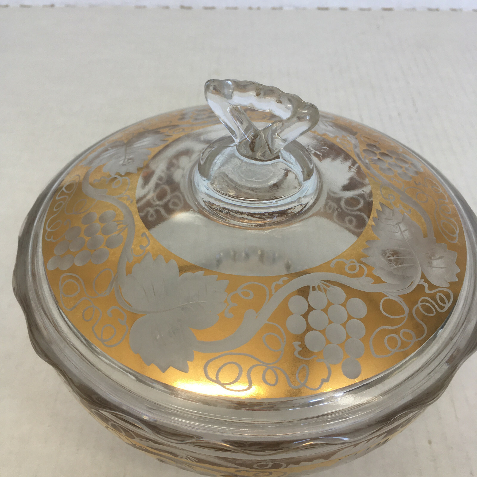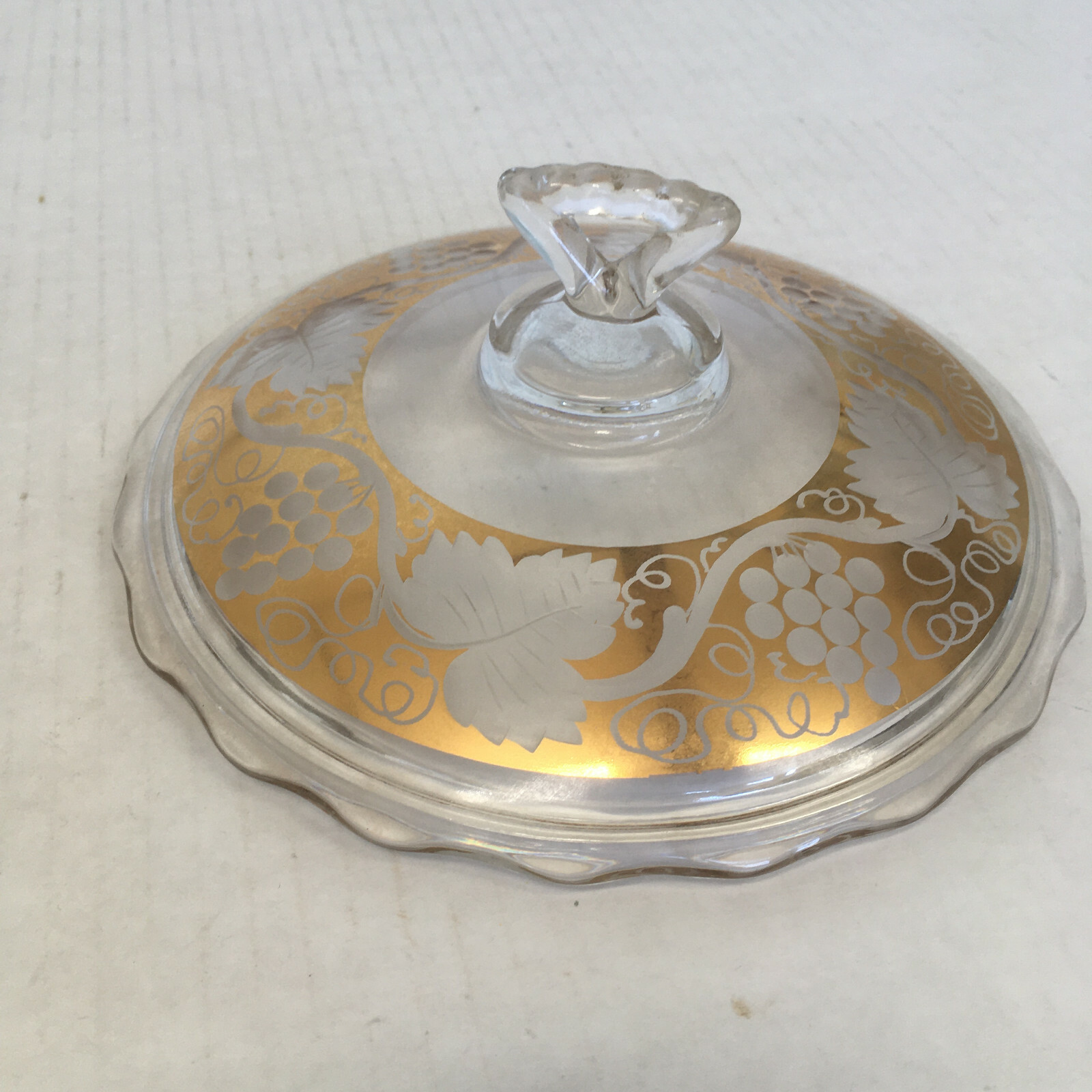 Vintage clear glass bowl with lid gold color grape design scalloped edge MCM