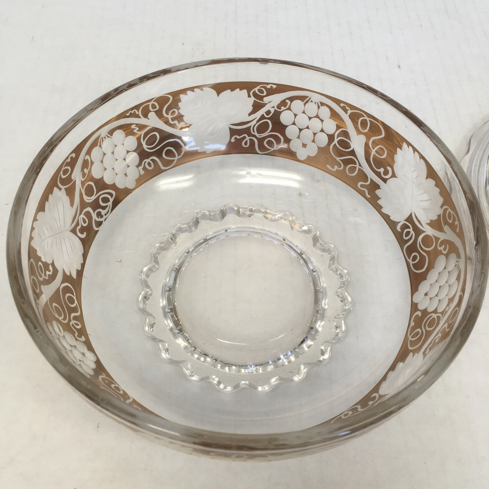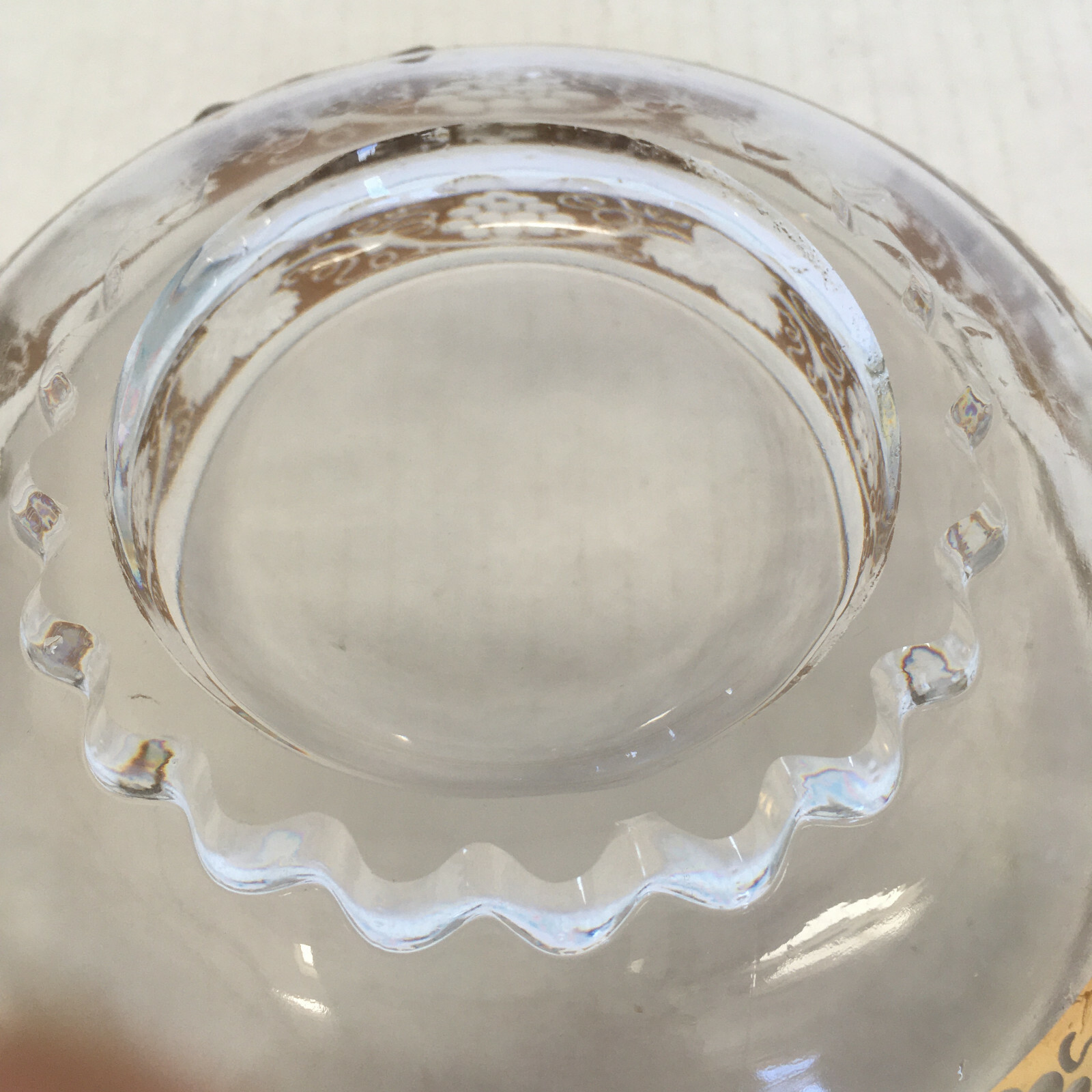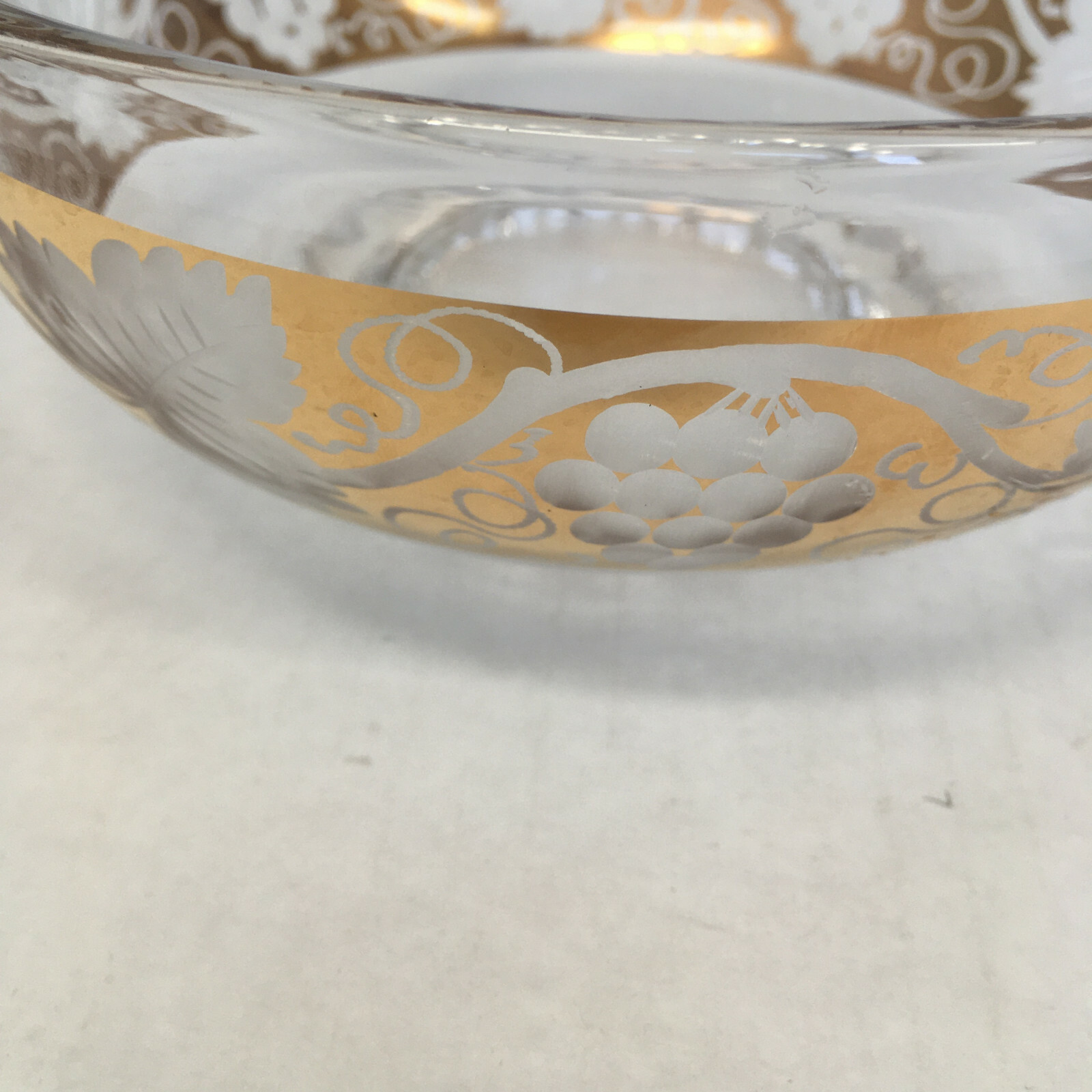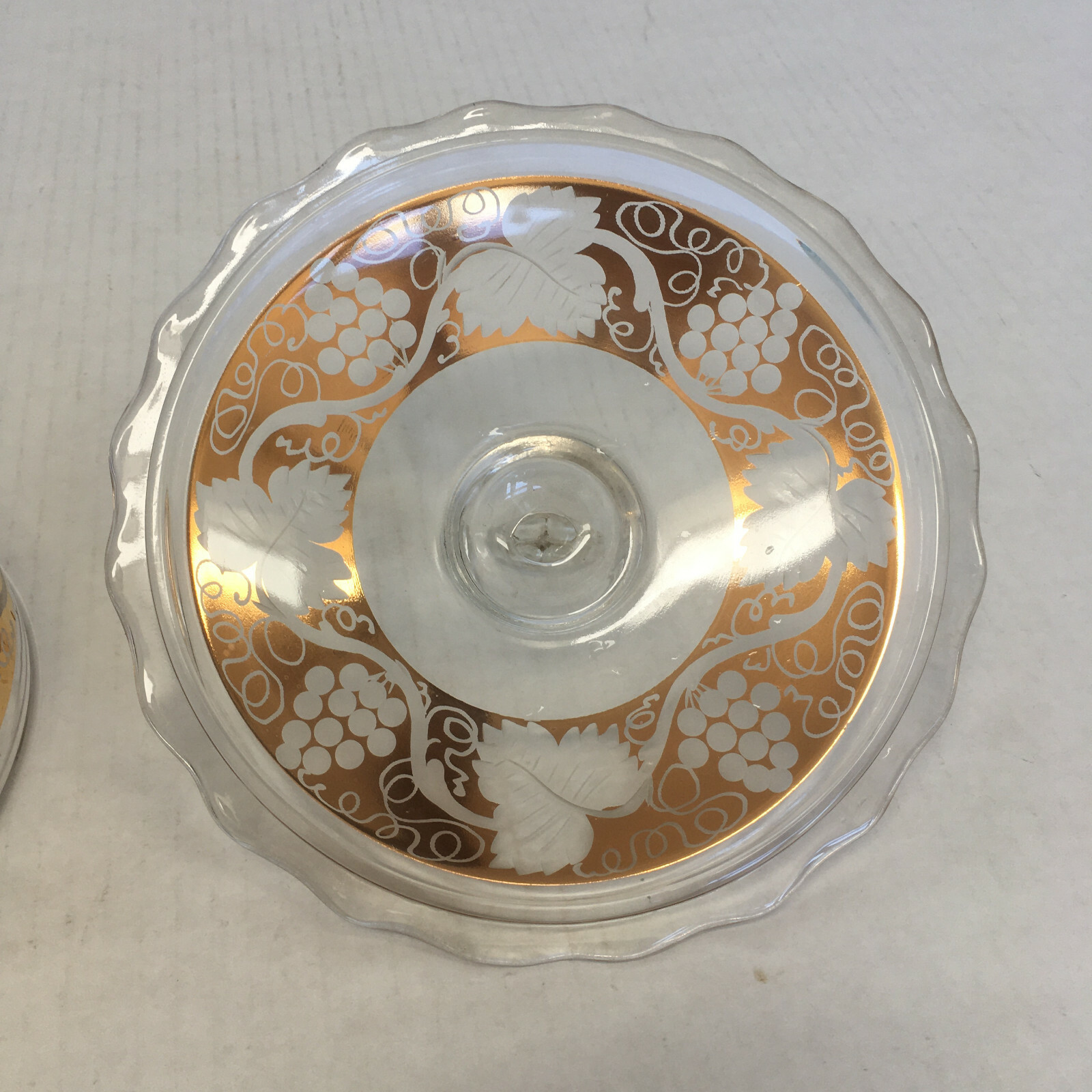 Vintage clear glass bowl with lid gold color grape design scalloped edge MCM