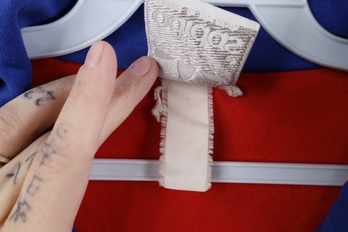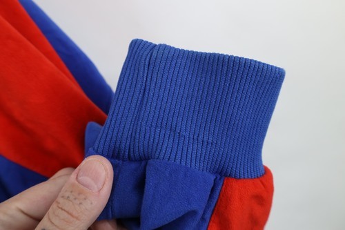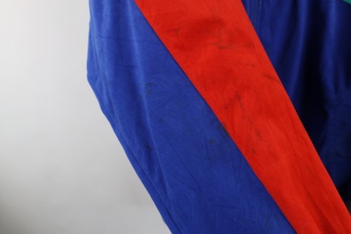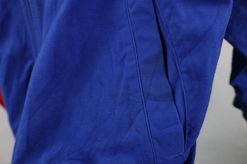 Stains throughout, and collar, inner lining. Fabric pull left cuff. Collar, cuffs, inner lining discolored. Dark lines/blemished throughout. Color faded. Pilling. Zipper tarnished. Tag faded, loose threads