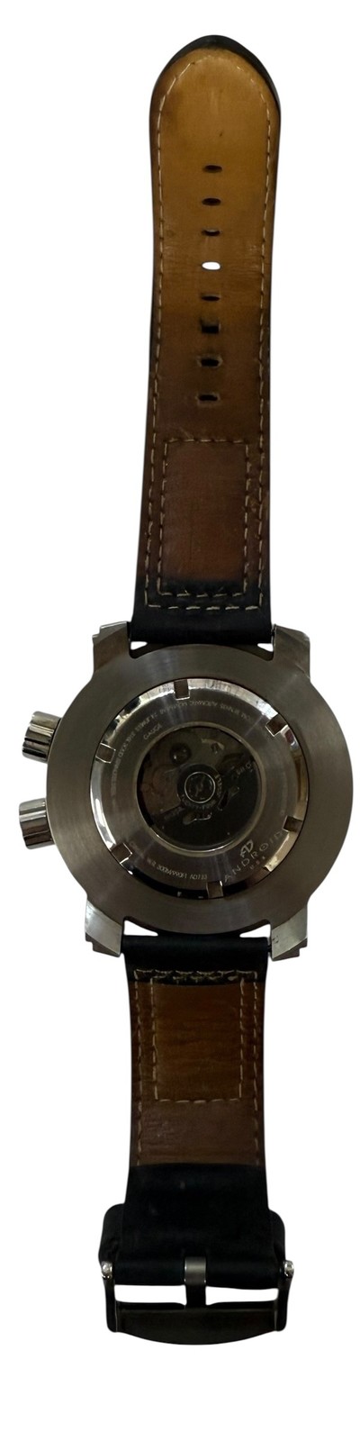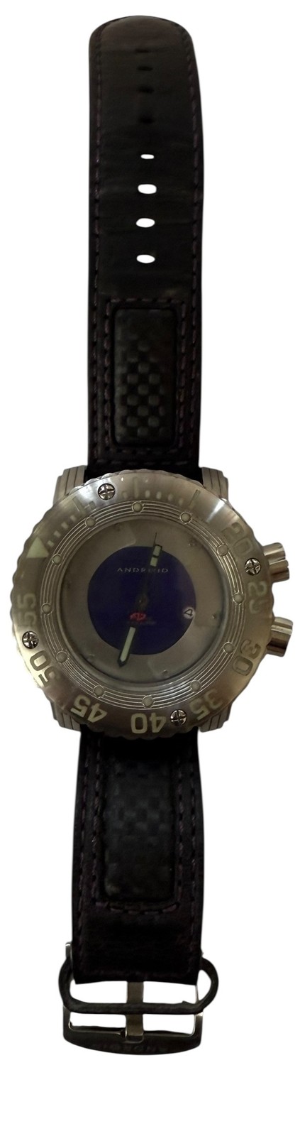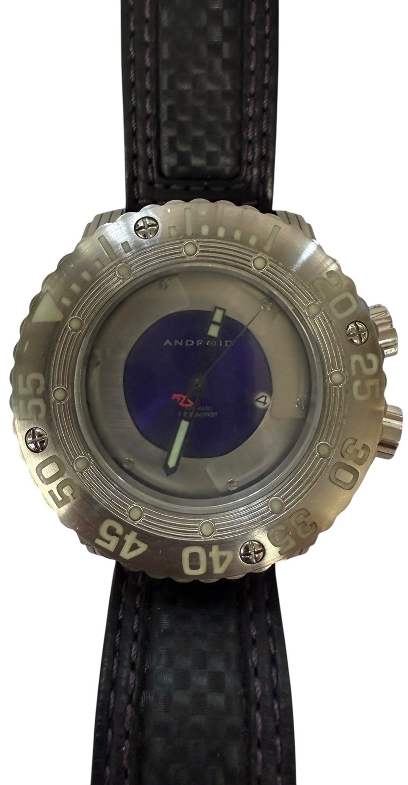 Type: Wrist watchBrand: AndroidModel number: AD733Model name: BladesCase width: 55MMWeight: 116.6Bracelet length: 9"Movement type: AutomaticCase Material: Stainless SteelBox included: noPaperwork included: noRunning: yesDial color: BlueBand material: LeatherBezel Material: Stainless SteelCondition:UsedNotes:Automatic watch with Blades covering Blue face
