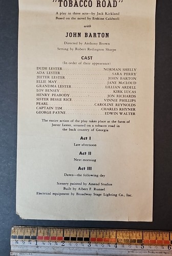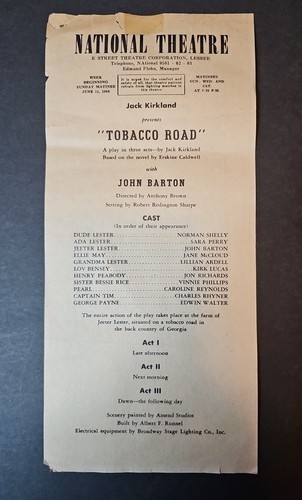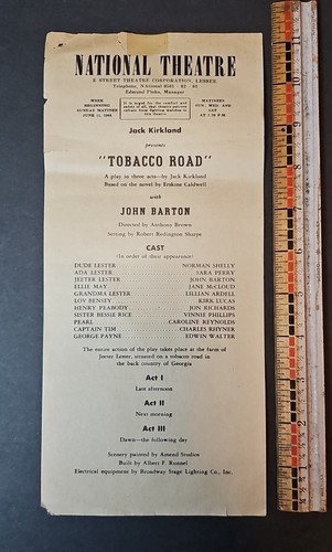 June 11th 1944 National Theatre Playbill -Jack Kirkland- Tobacco Road