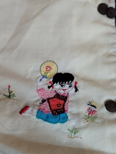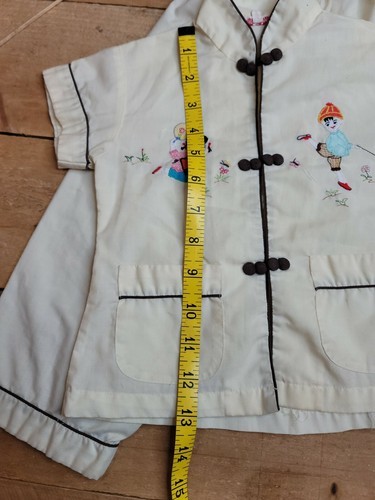 UP FOR SALE: Adorable vintage Plum Blossoms toddler girl 2-piece set. Traditional Chinese-style embroidered outfit featuring a short-sleeve top with frog button closures and matching pants. Ivory/cream with colorful embroidery including children and flowers. Black piping detail throughout.