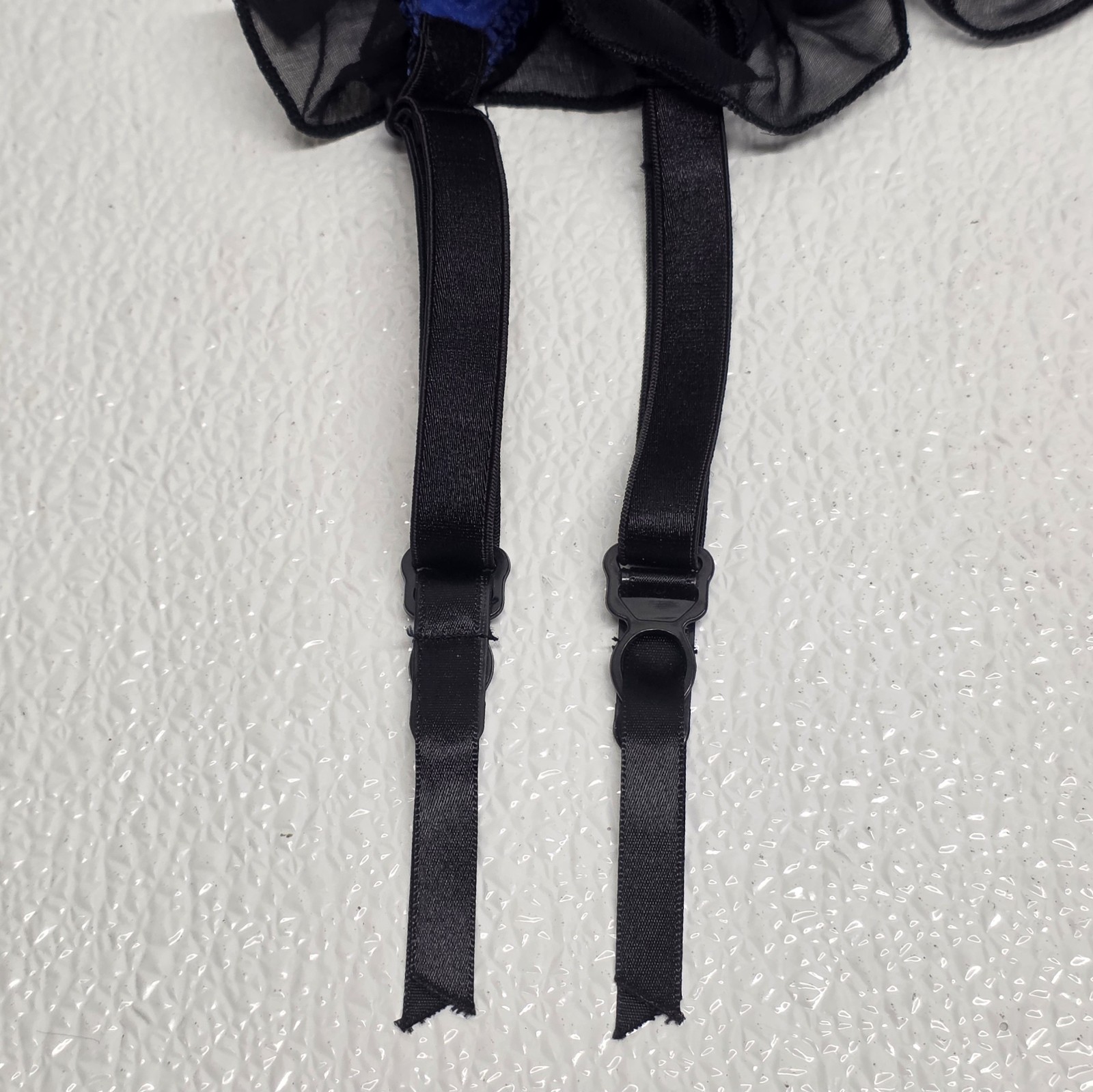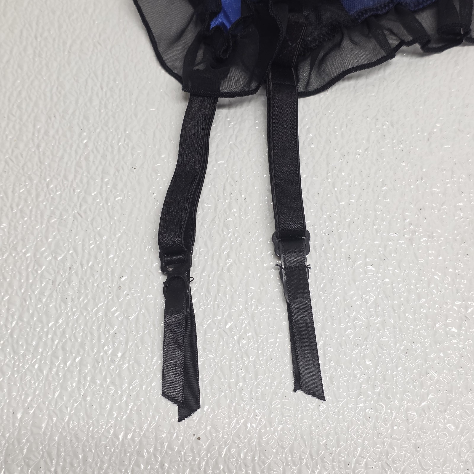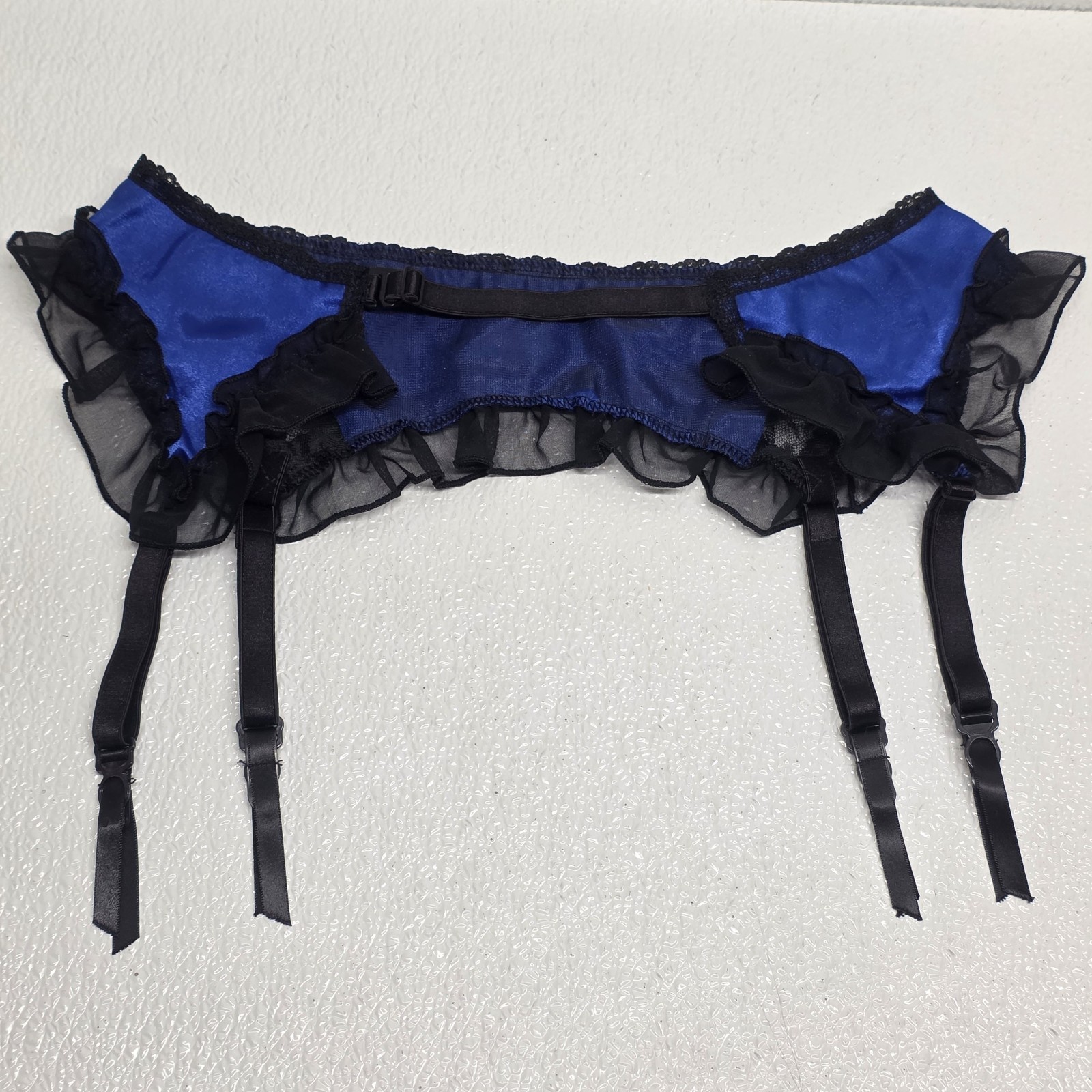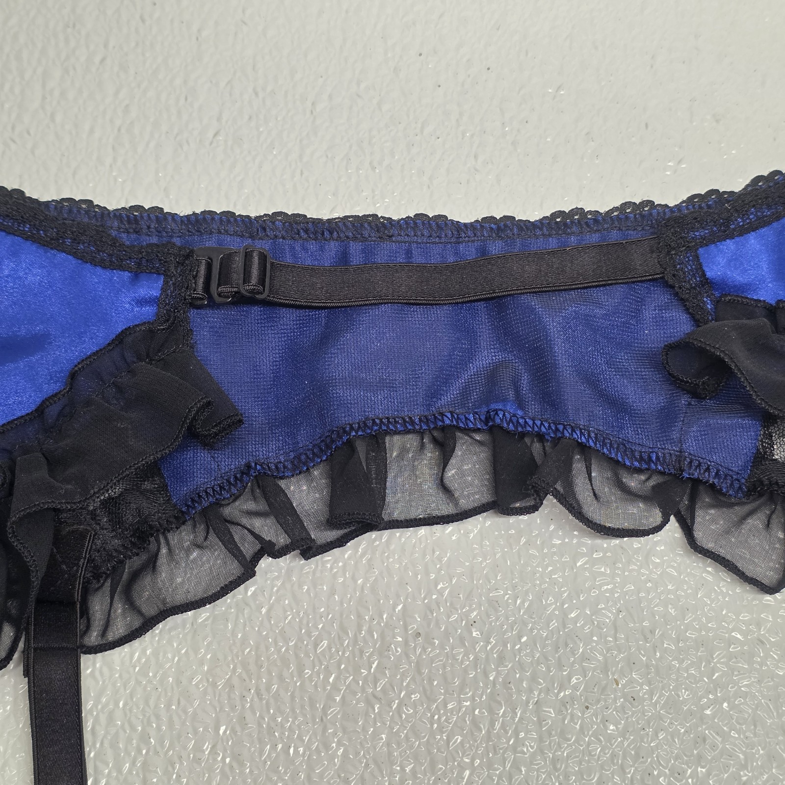 Vintage Frederick?s Of Hollywood Lace Garter Belt Lingerie Blue Black - Says One Size but measures between 24" and 26" when you adjust it. Images show actual item that will ship.
