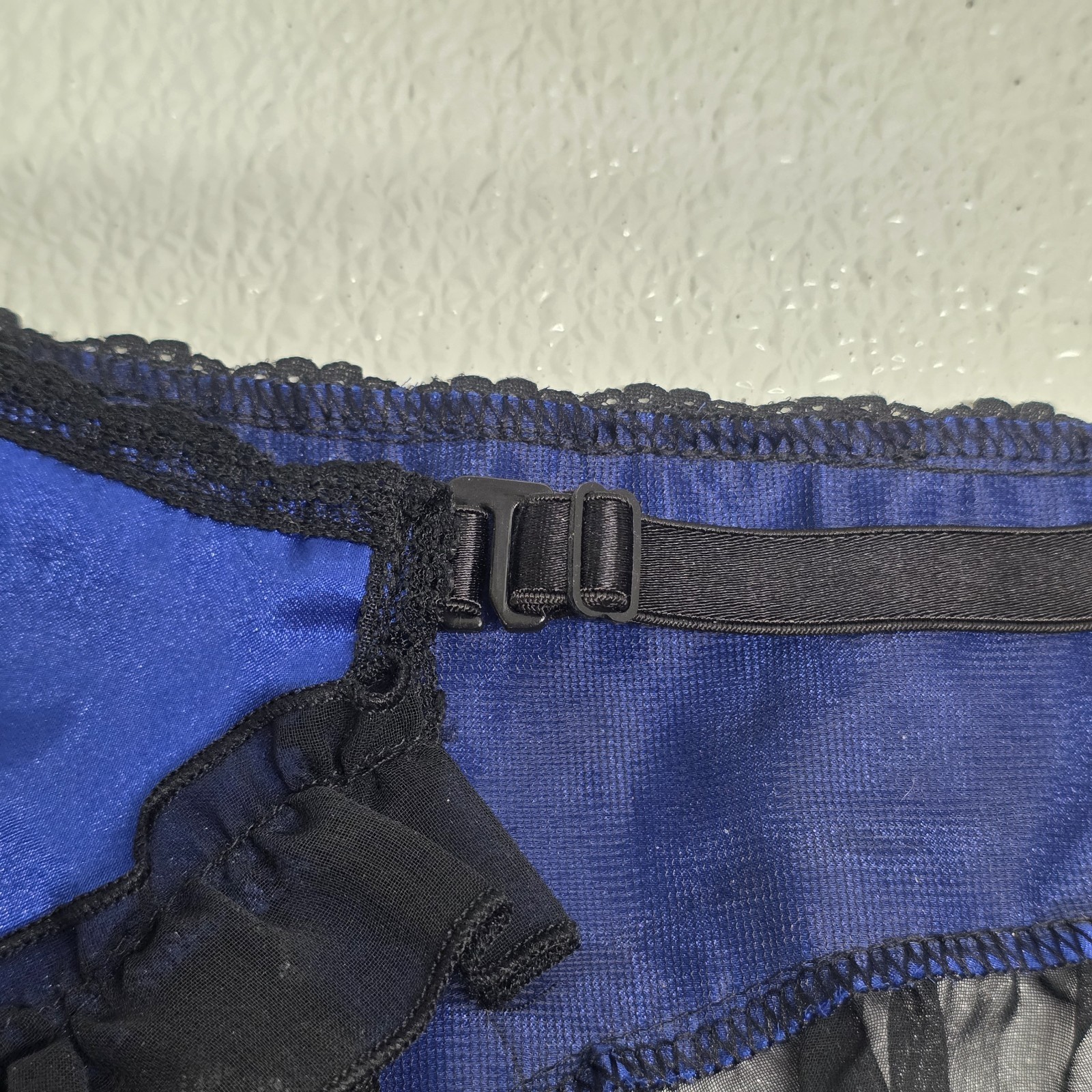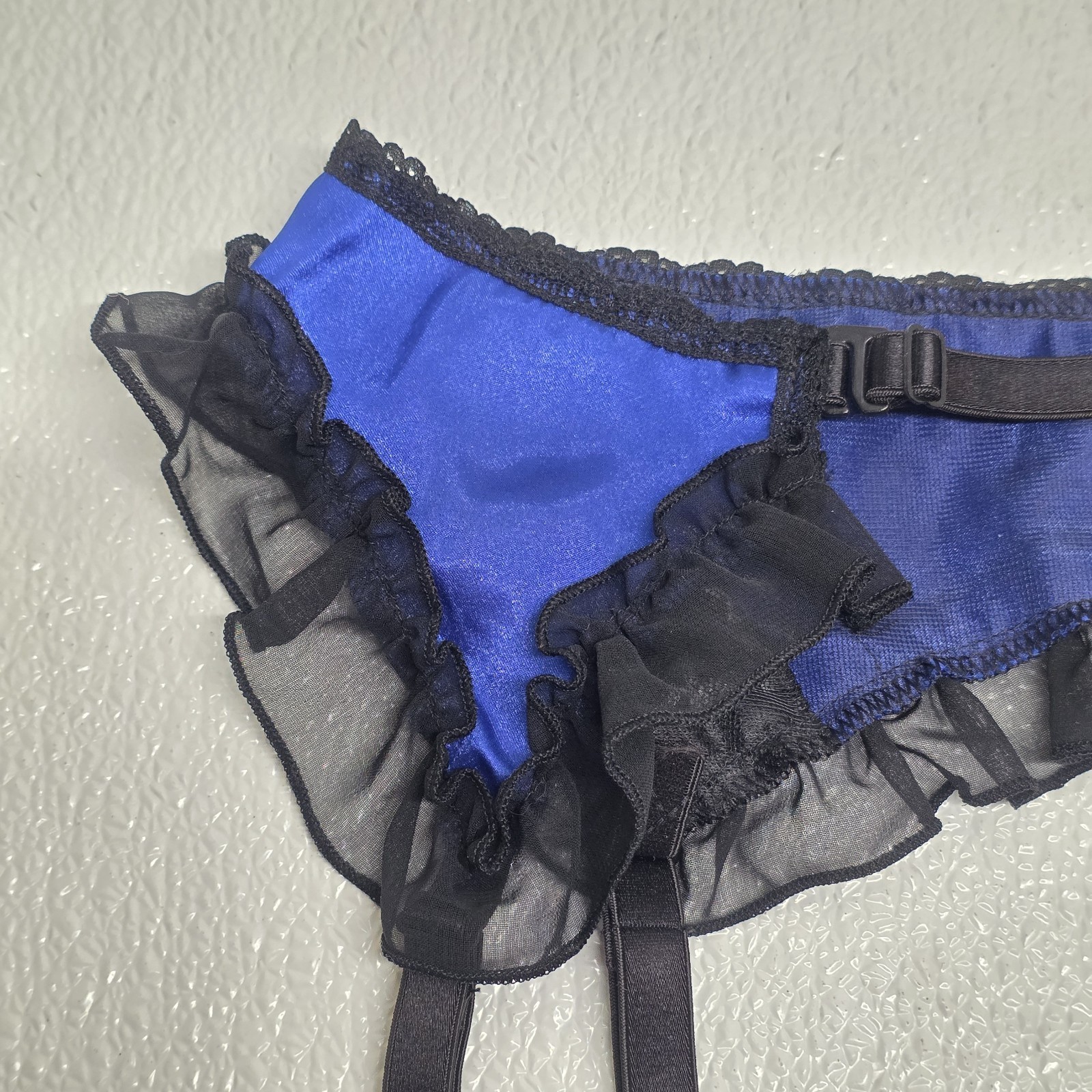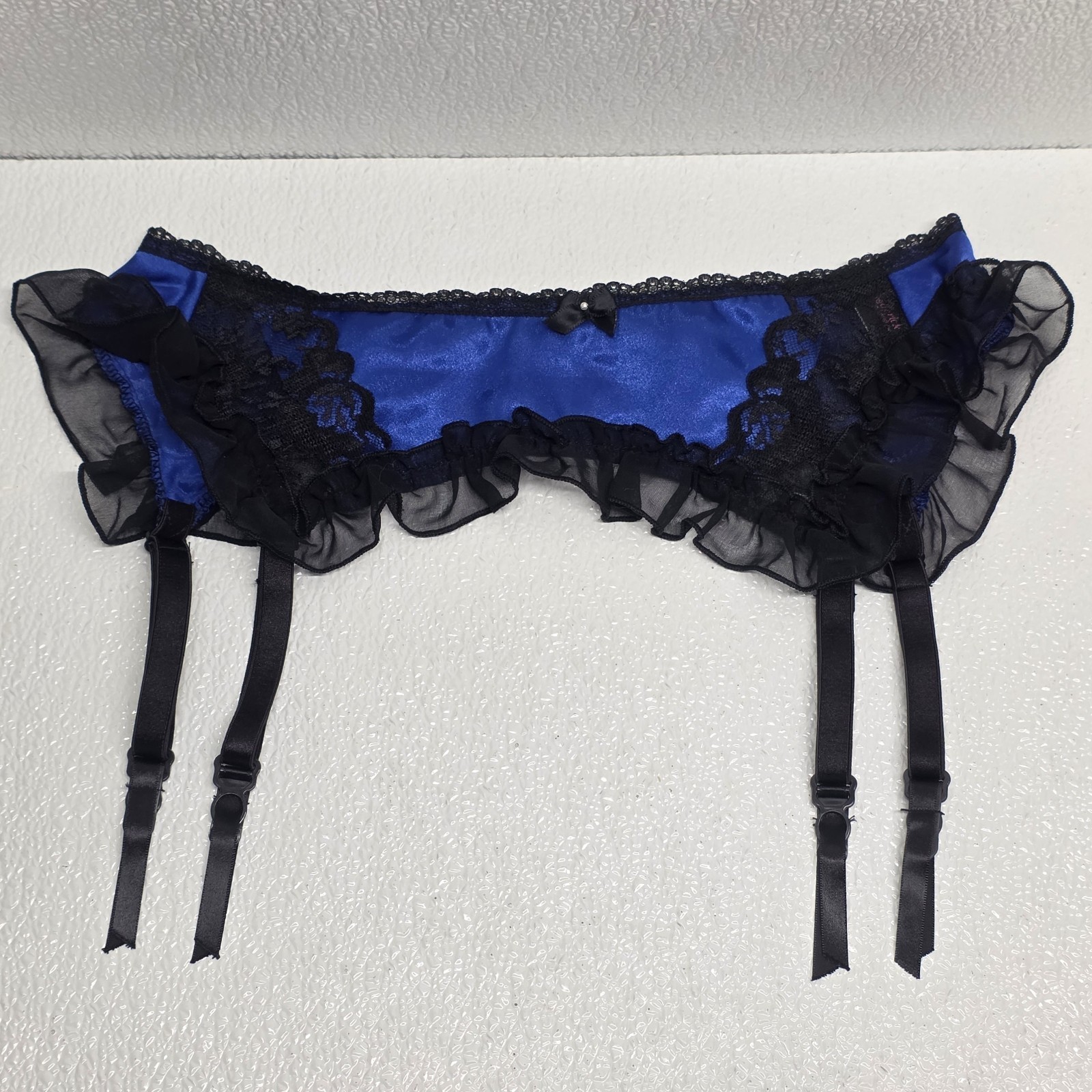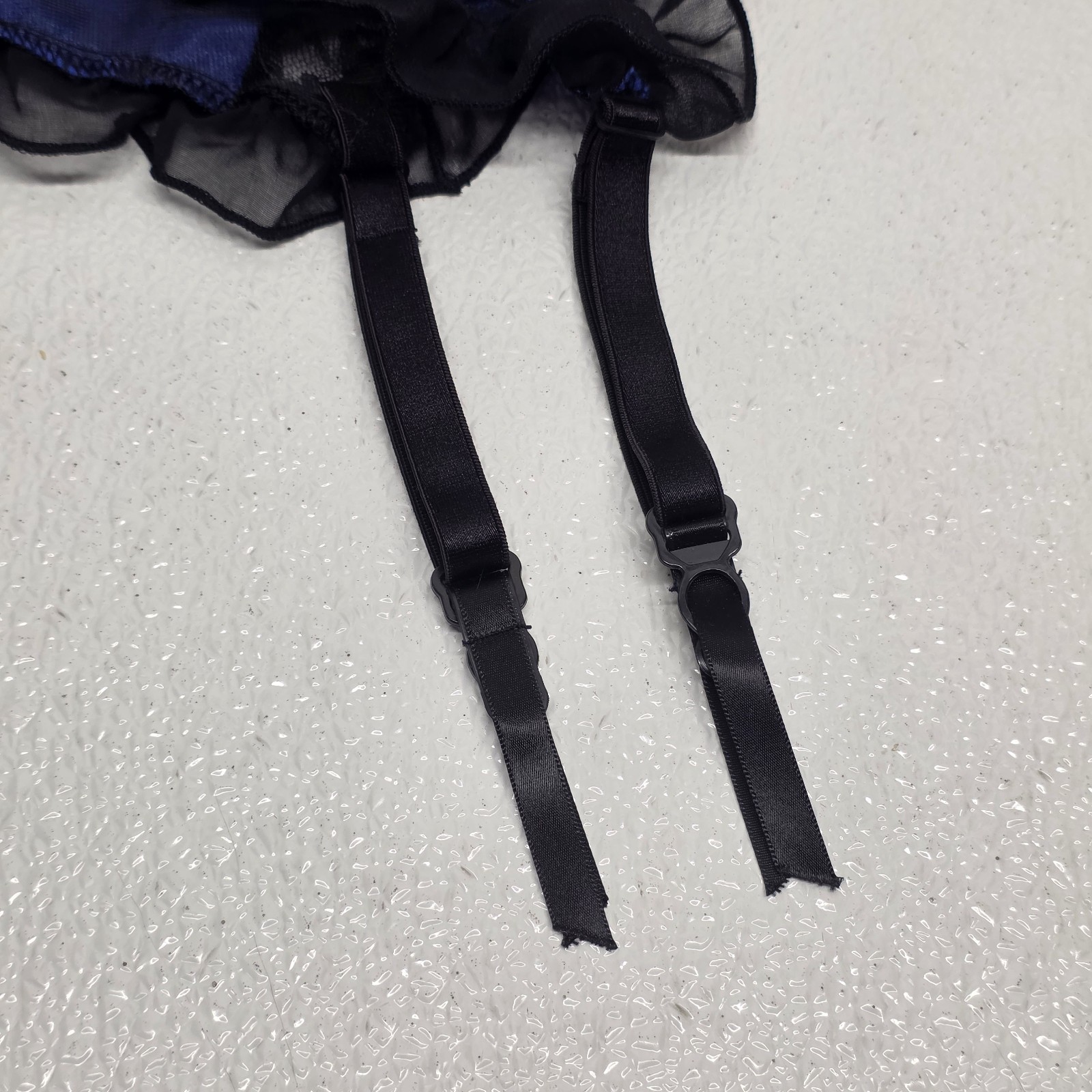 Vintage Frederick?s Of Hollywood Lace Garter Belt Lingerie Blue Black - Says One Size but measures between 24" and 26" when you adjust it. Images show actual item that will ship.