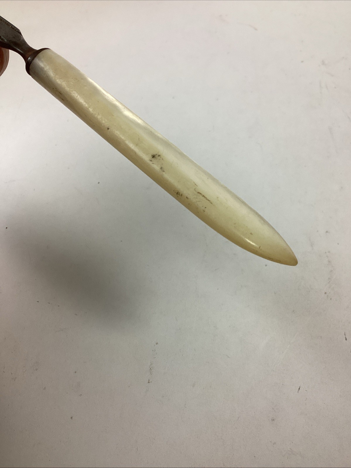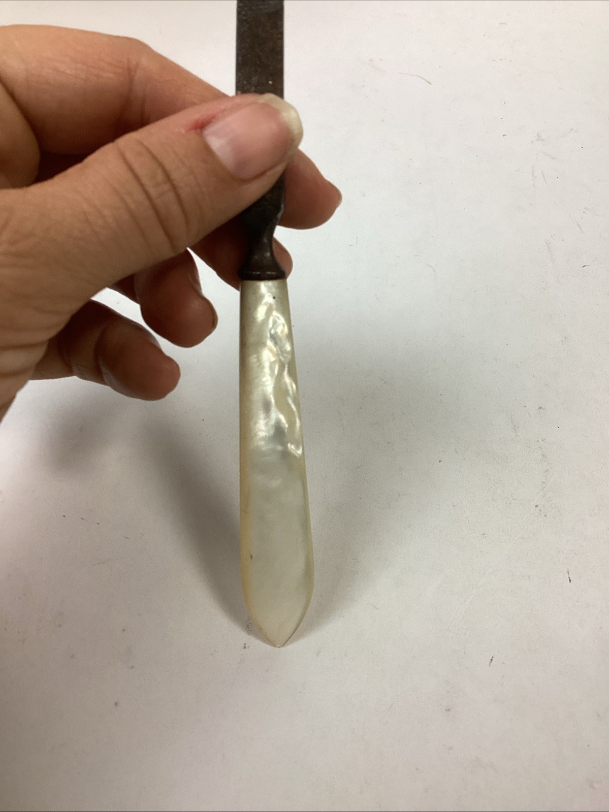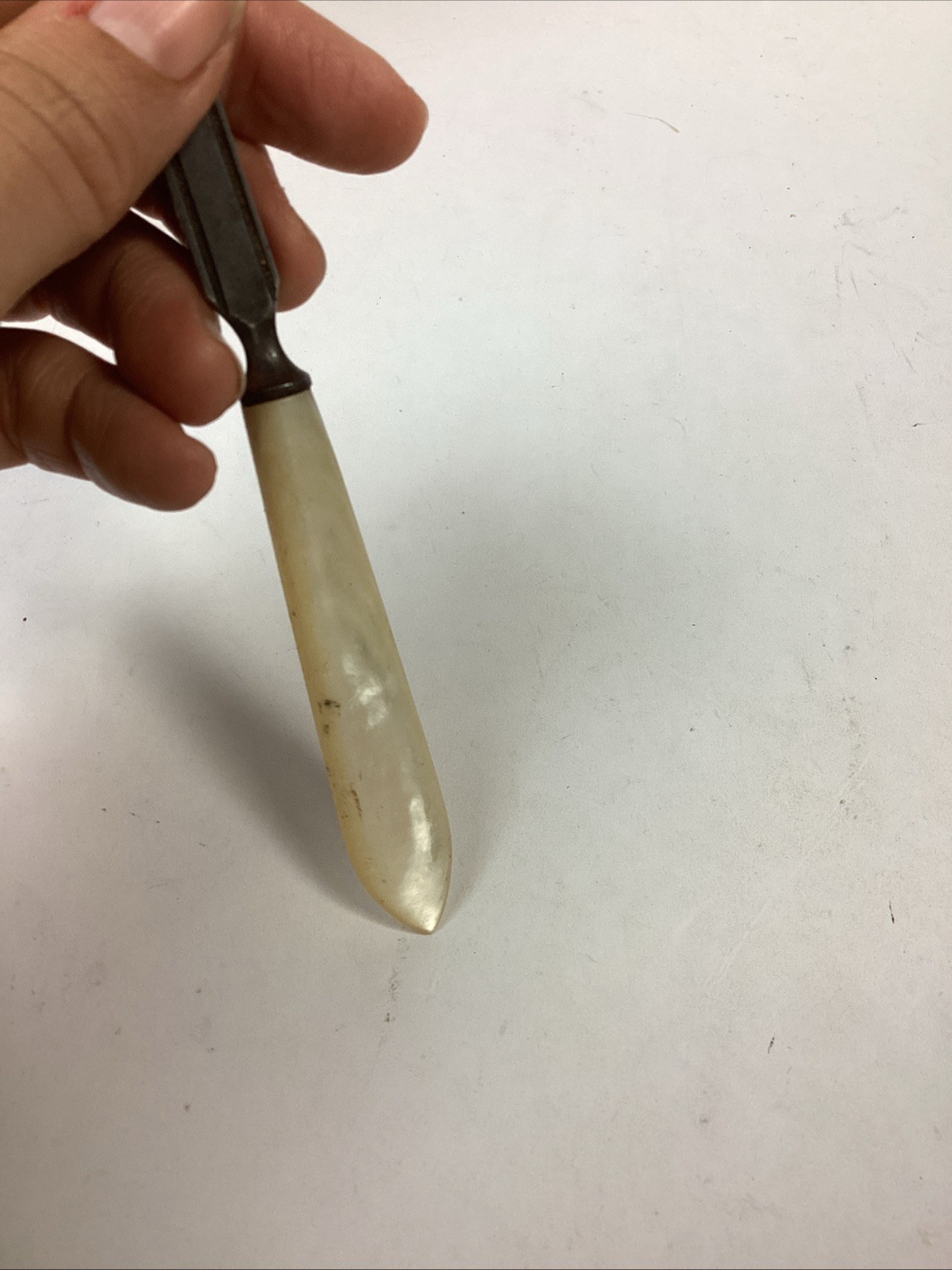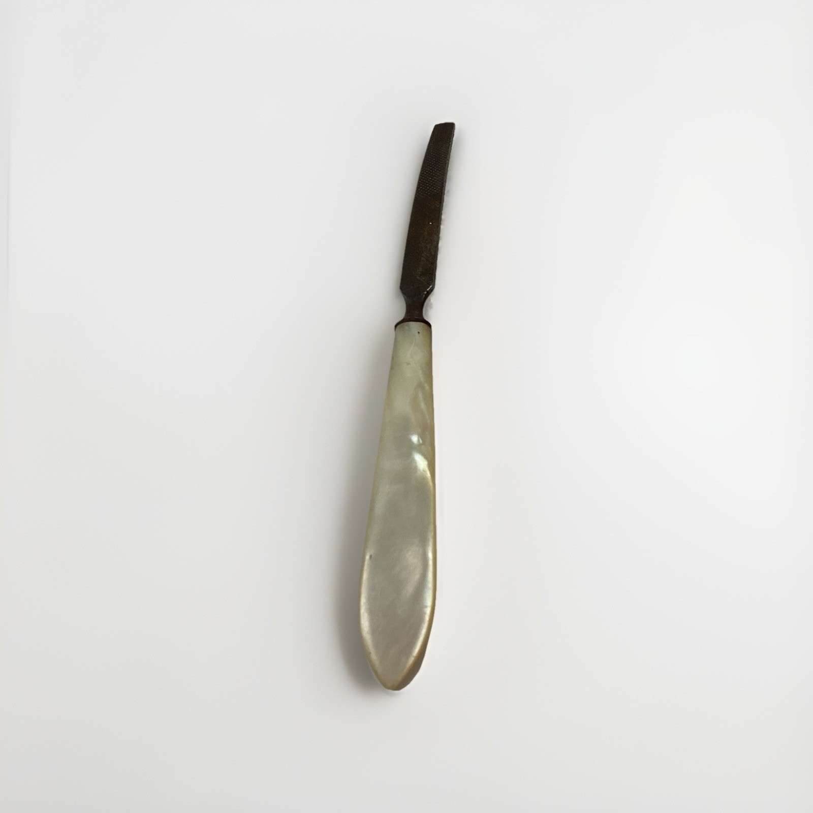 Vintage Mother Of Pearl Nail File. In good, used condition. The handle has a few stains and the file part is naturally curved. This is 6.5?L
