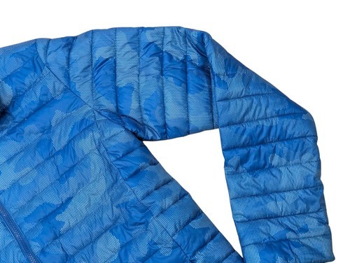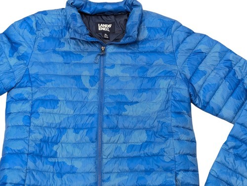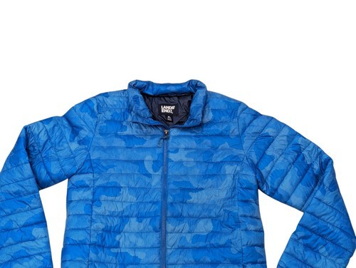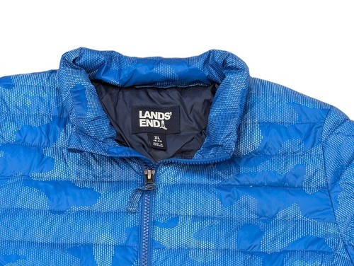 This is a beautiful boy's lands and packable puffer jacket. Size extra large 18/20. Beautiful blue digital camo type print. Lightweight yet warm. It's in excellent condition. It looks like new
