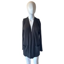 Classic black ribbed knit cardigan by Coutelle. Features an open front, long sleeves, and two front pockets. Soft rayon-blend fabric makes it a versatile layering piece for work, casual, or travel. Size Medium.