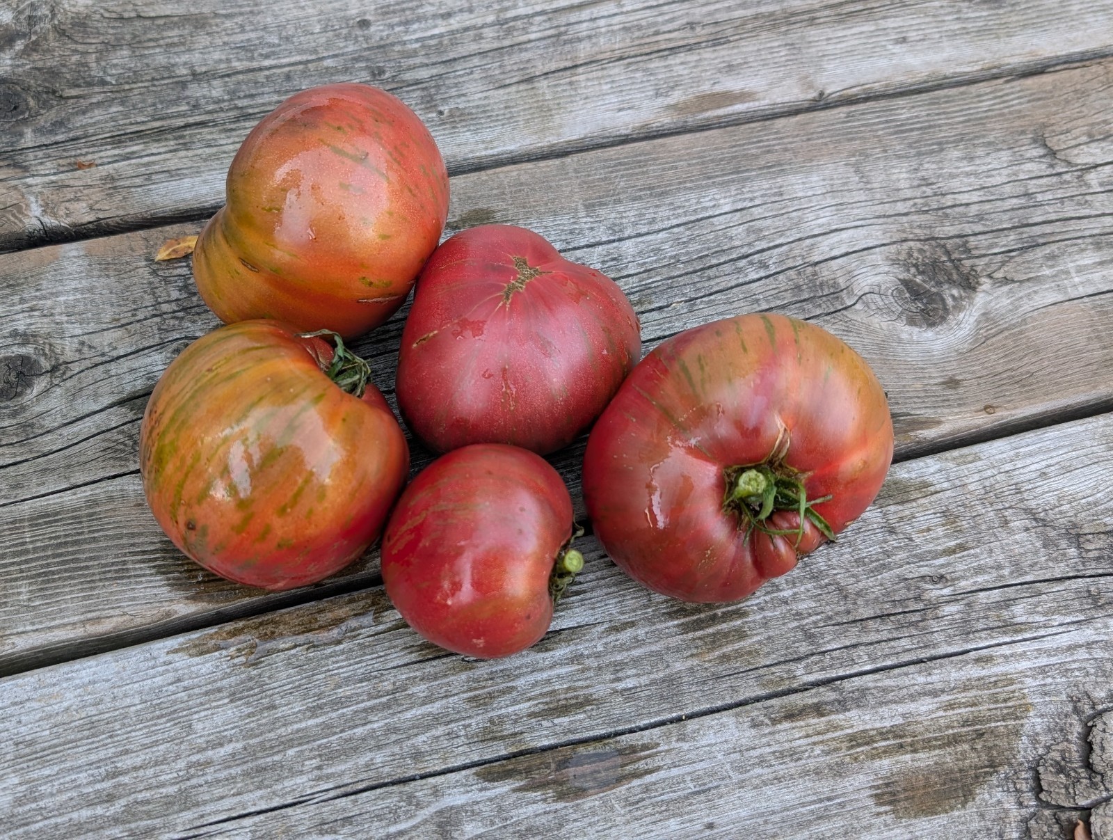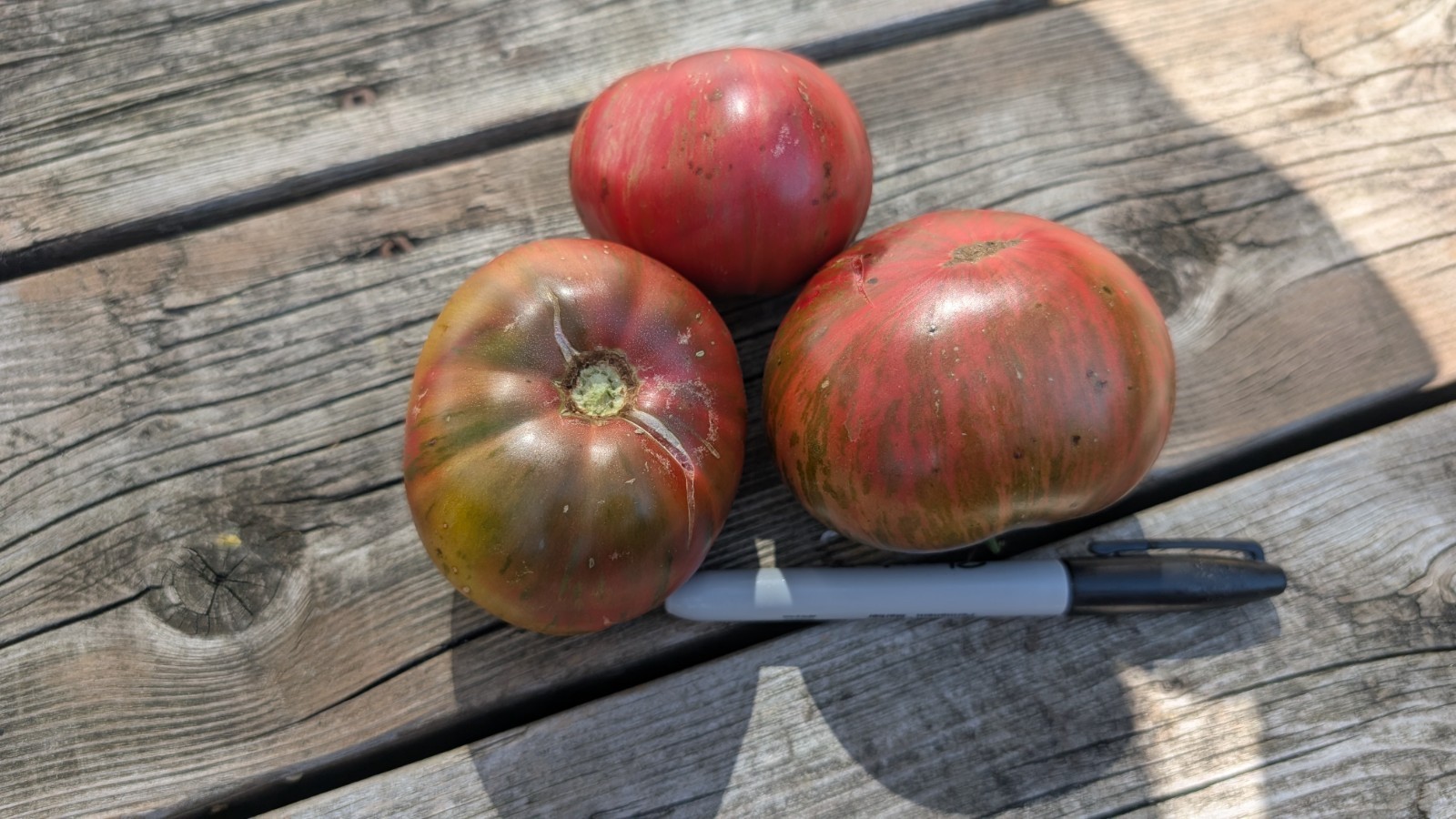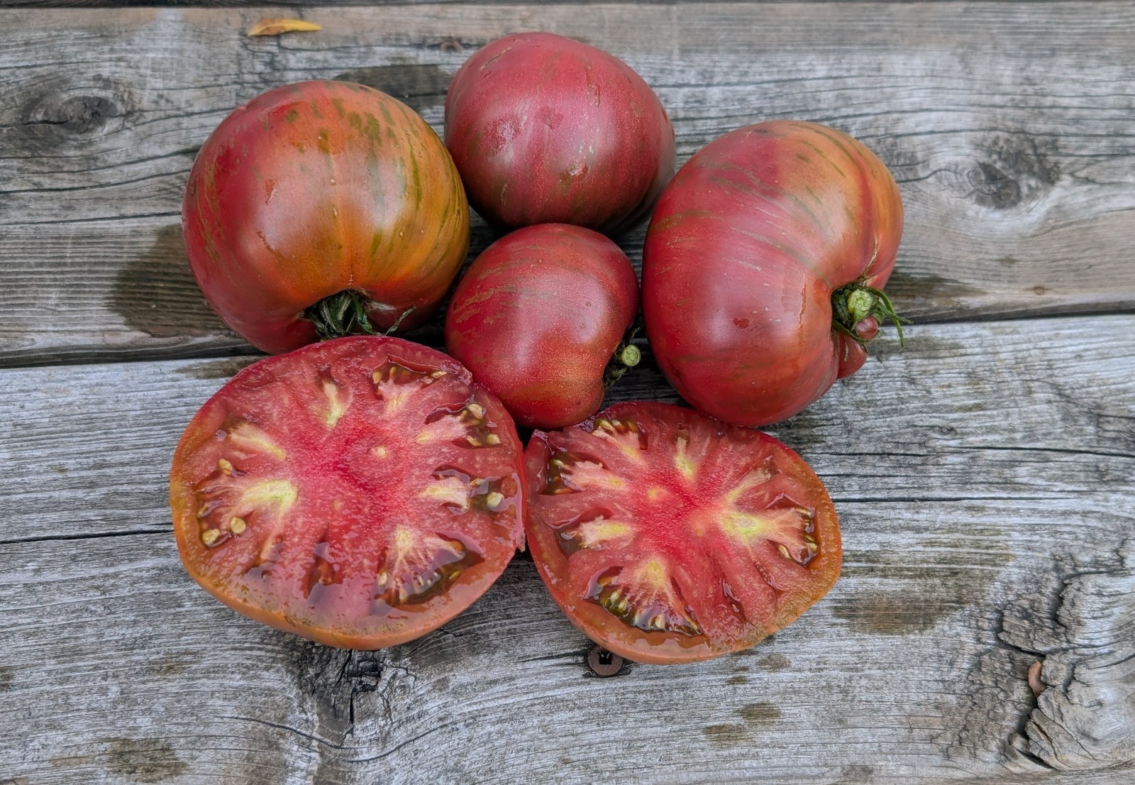 Fruit color is a rich burgundy-pink with dark green metallic stripes, giving it a dramatic and ornamental appearance. The tomatoes are oblate to slightly heart-shaped, measuring about 3 to 4 inches across. They are not considered cherry tomatoes. Fruit weight ranges from 4 to 12 ounces, with occasional fruits reaching up to 14 ounces.