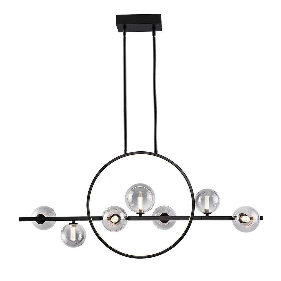 Matte Black Island Pendant with Smoked Glass Shades. A multi-light island pendant with serious allure, the contemporary Luna has eight integrated lights. Edison-style dimmable LED bulbs, smoked glass shades, and thin lines make it ideal for dining rooms and beyond. It is suspended from a thin plate for an extra subtle finish and adjustability. The center ring adds a multi-directional light output through a transparent diffuser.