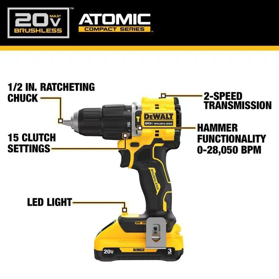 DEWALT ATOMIC 20-Volt Lithium-Ion Cordless 1/2 in. Compact Hammer Drill with 3.0Ah Battery, Charger and Bag