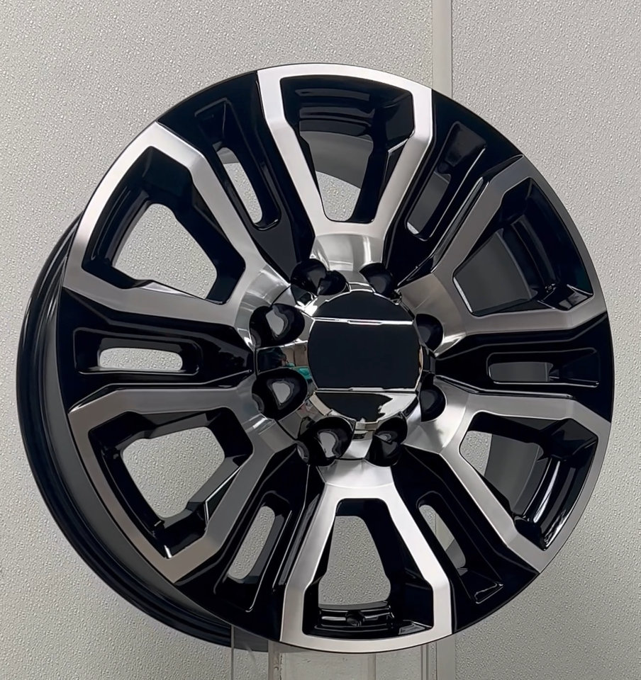 New set of four GM Style Replica 20 inch Gloss Black and Machine 8-Lug (8x180) 12 Spoke Wheels for 2011 and newer GMC Sierra 2500 HD, 3500 HD SRW